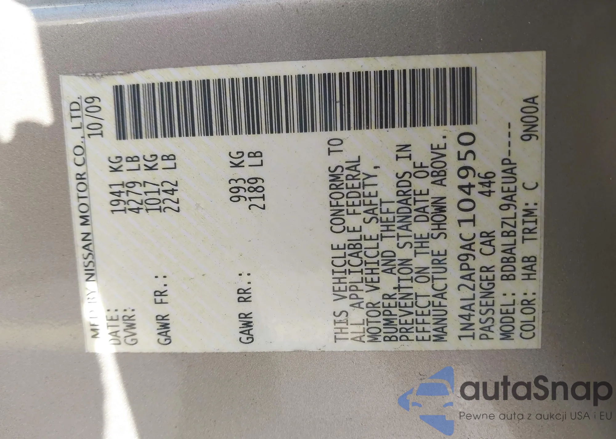 Samochód Nissan Altima 2010 (VIN 1N4AL2AP9AC104950) nie był wcześniej licytowany. Dokumenty są czyste, przebieg odpowiada lub jest niższy niż średnia rynku. Sprzedaje go firma ubezpieczeniowa – polecamy zakup. Dostawa do portu zajmie ok. 6–8 tygodni.
