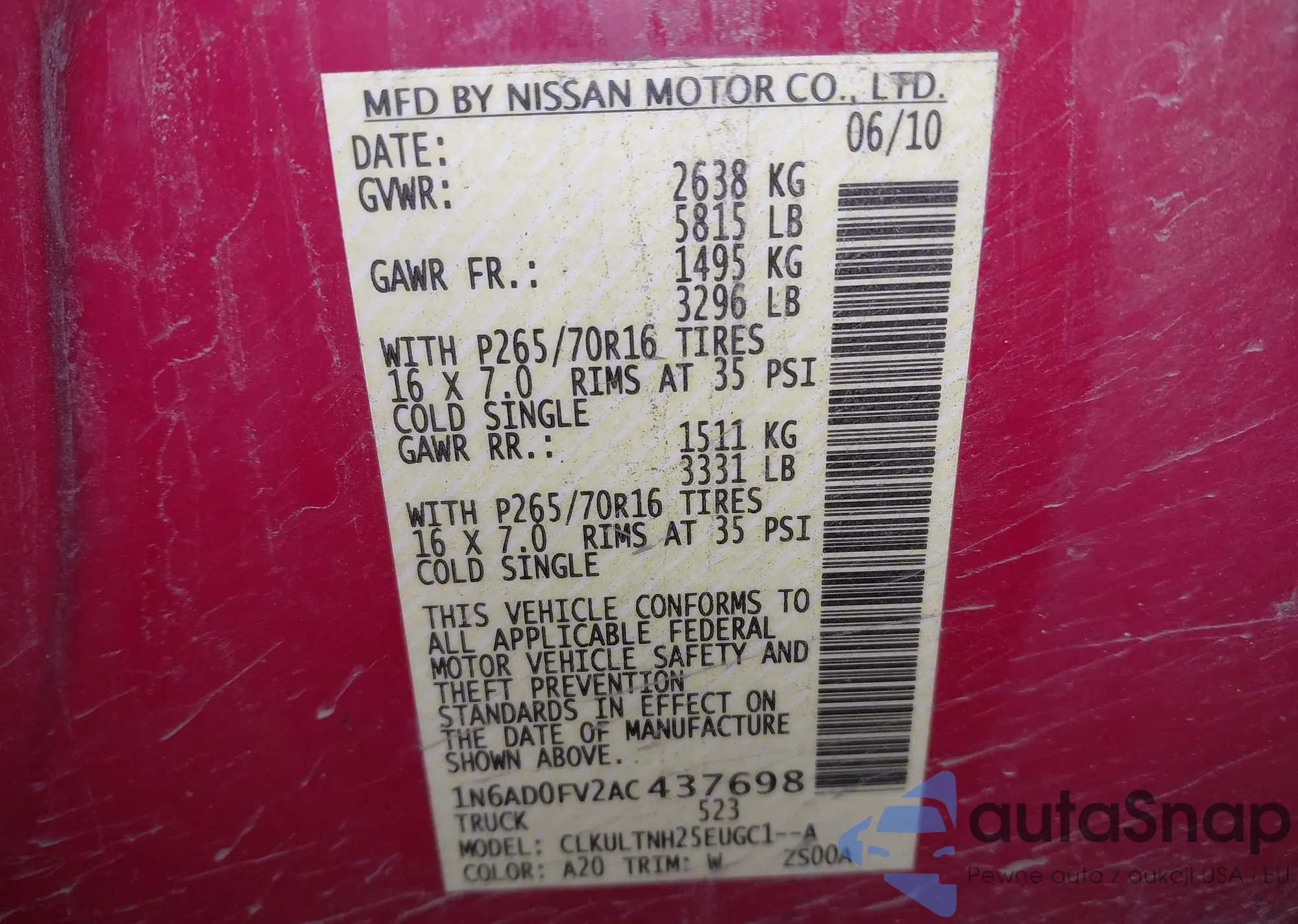 Samochód Nissan Navara (Frontier) 2010 (VIN 1N6AD0FV2AC437698) nie był wcześniej licytowany. Dokumenty są czyste, przebieg odpowiada lub jest niższy niż średnia rynku. Sprzedaje go firma ubezpieczeniowa – polecamy zakup. Dostawa do portu zajmie ok. 6–8 tygodni.