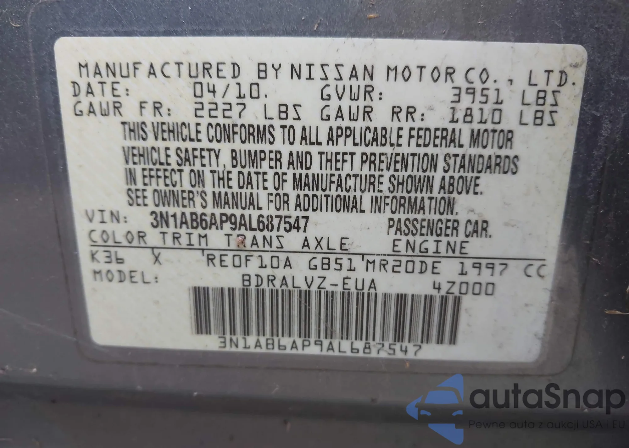 Samochód Nissan Sentra 2010 (VIN 3N1AB6AP9AL687547) sprzedaje go niezweryfikowany sprzedawca. Zalecamy raport Carfax i potwierdzenie możliwości rejestracji pojazdu przed zakupem.