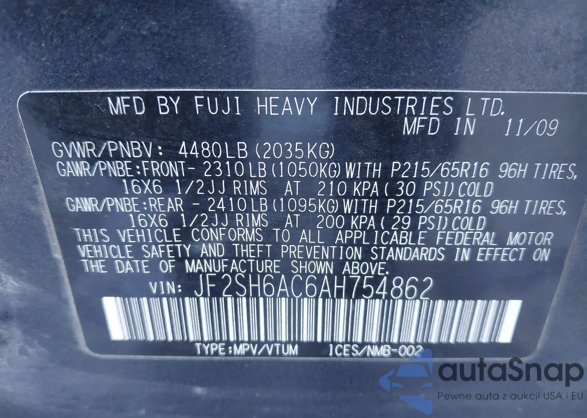 VIN: JF2SH6AC6AH754862