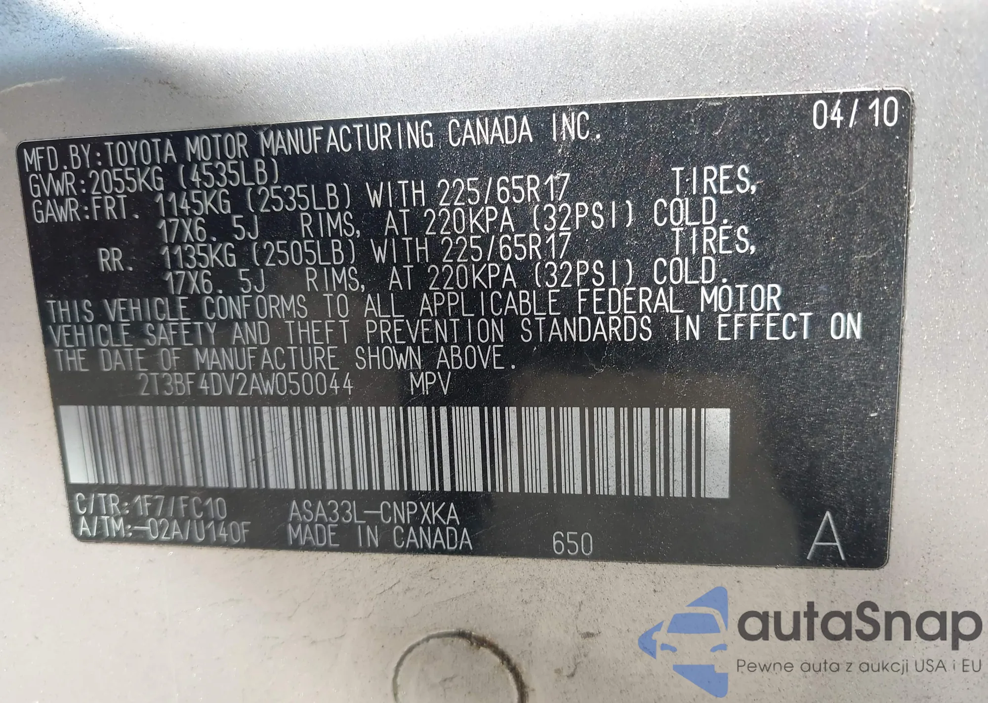 VIN: 2T3BF4DV2AW050044