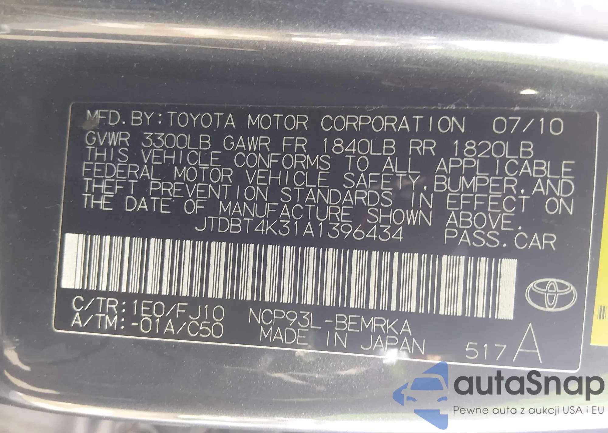 Samochód Toyota Yaris 2010 (VIN JTDBT4K31A1396434) nie był wcześniej licytowany. Dokumenty są czyste, przebieg odpowiada lub jest niższy niż średnia rynku. Sprzedaje go firma ubezpieczeniowa – polecamy zakup. Dostawa do portu zajmie ok. 6–8 tygodni.