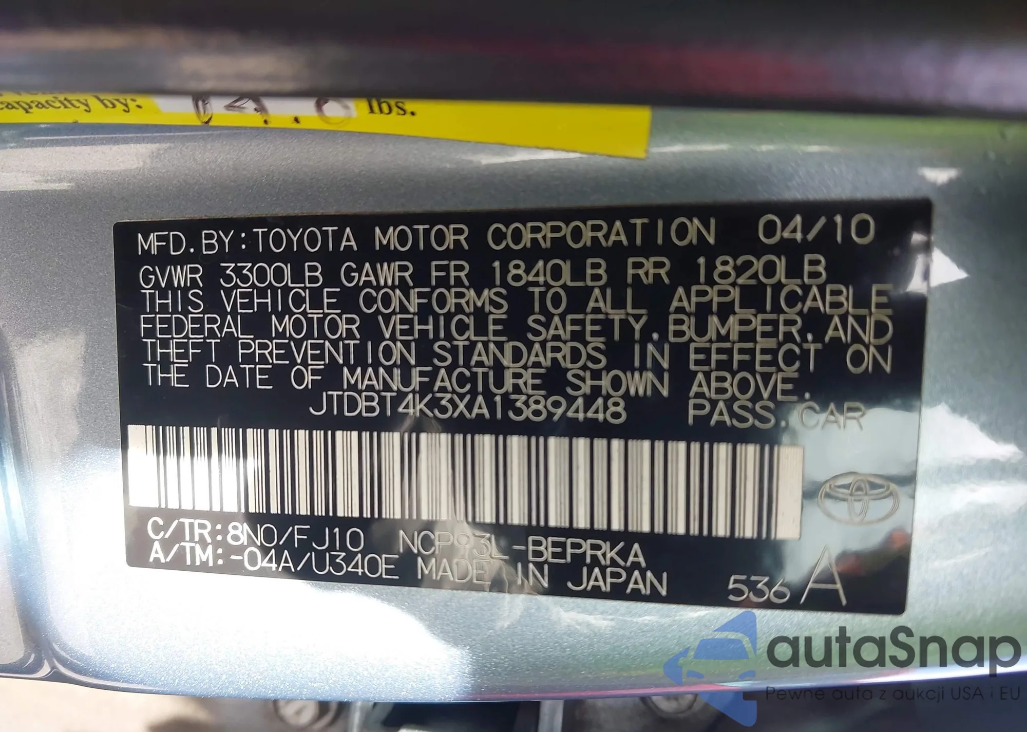 Samochód Toyota Yaris 2010 (VIN JTDBT4K3XA1389448) sprzedaje go niezweryfikowany sprzedawca. Zalecamy raport Carfax i potwierdzenie możliwości rejestracji pojazdu przed zakupem.