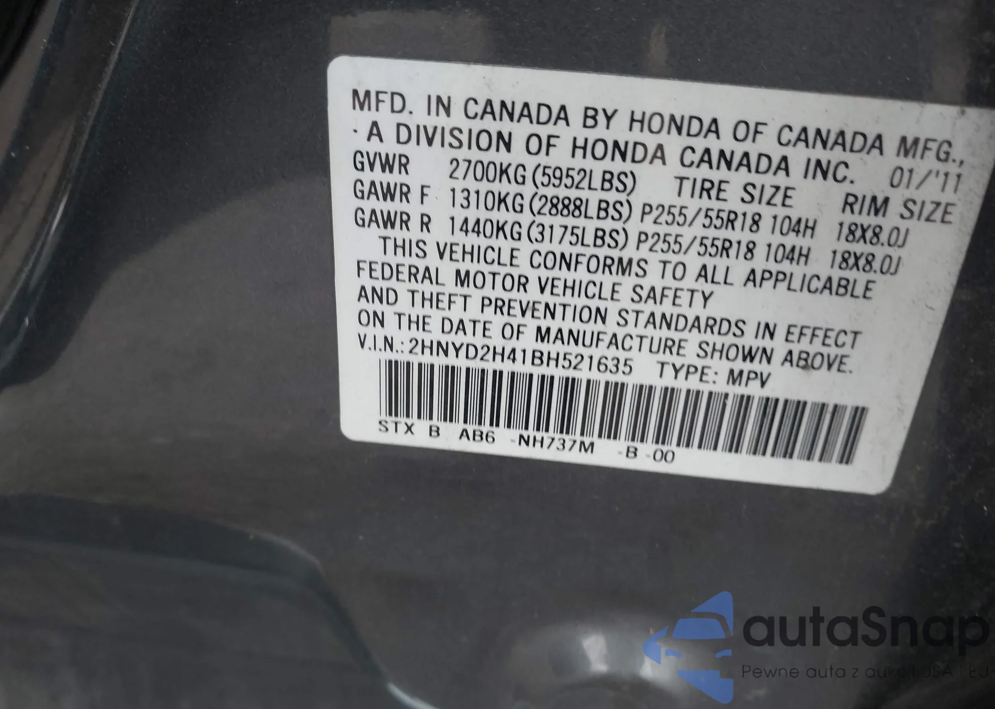 VIN: 2HNYD2H41BH521635