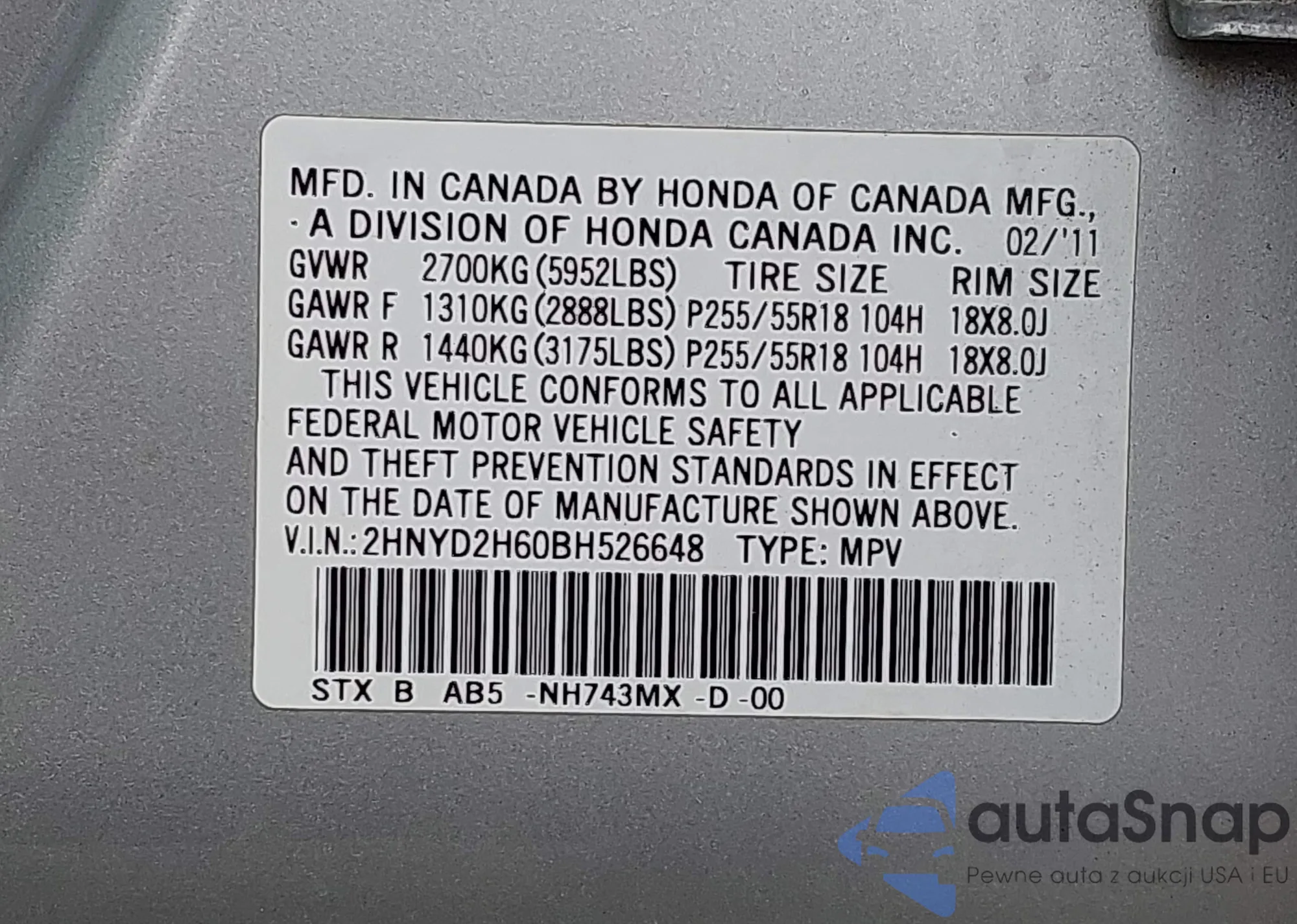 VIN: 2HNYD2H60BH526648