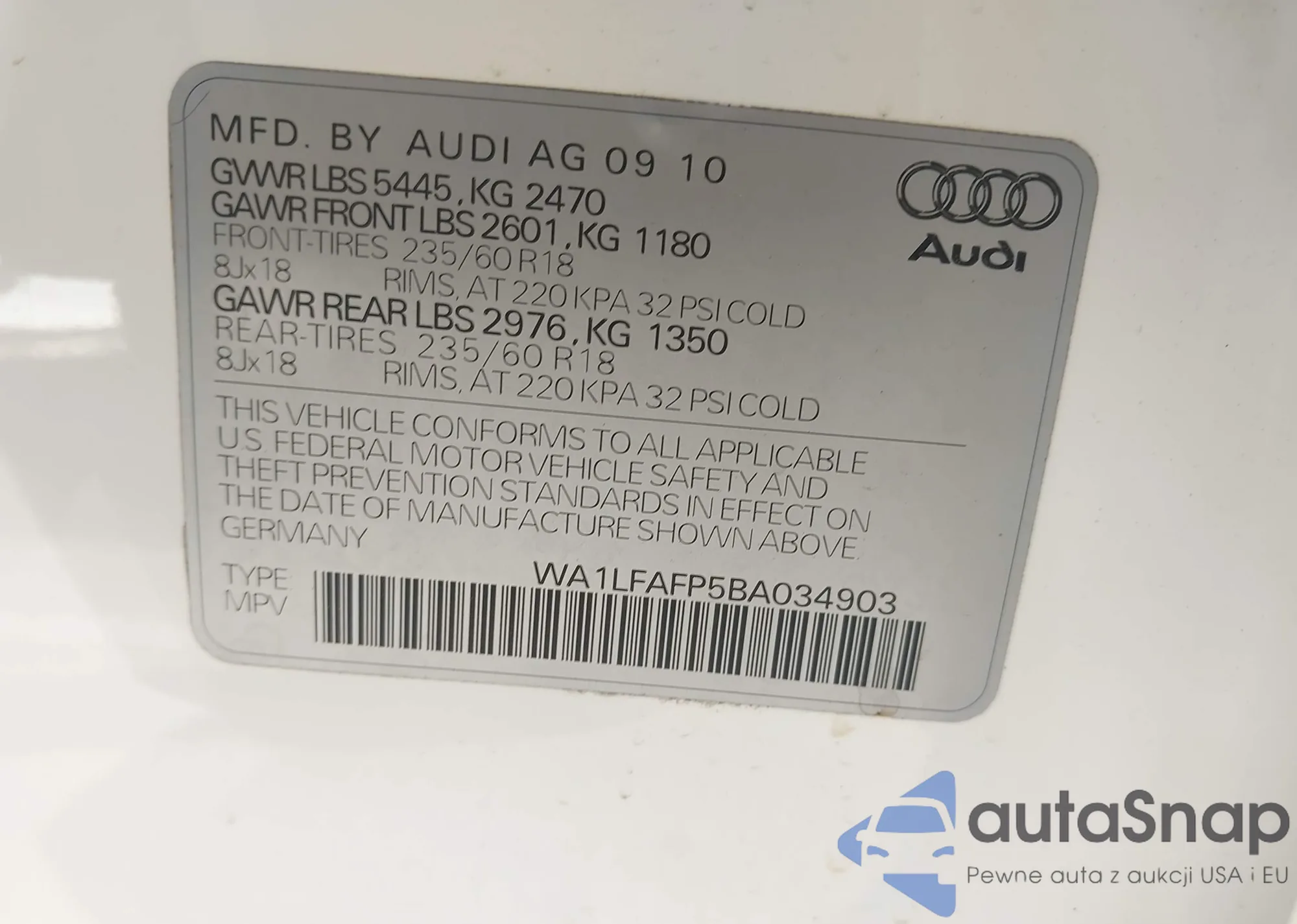 Samochód Audi Q5 2011 (VIN WA1LFAFP5BA034903) nie był wcześniej licytowany. Dokumenty są czyste, przebieg odpowiada lub jest niższy niż średnia rynku. Sprzedaje go firma ubezpieczeniowa – polecamy zakup. Dostawa do portu zajmie ok. 6–8 tygodni.