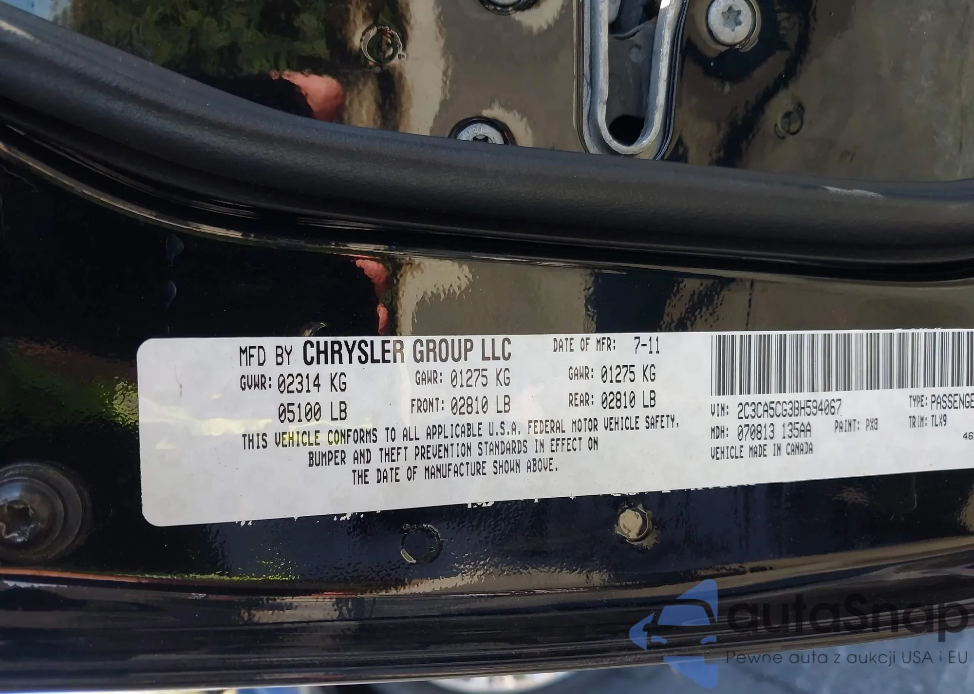 Samochód Chrysler 300 2011 (VIN 2C3CA5CG3BH594067) nie był wcześniej licytowany. Dokumenty są czyste, przebieg odpowiada lub jest niższy niż średnia rynku. Sprzedaje go firma ubezpieczeniowa – polecamy zakup. Dostawa do portu zajmie ok. 6–8 tygodni.