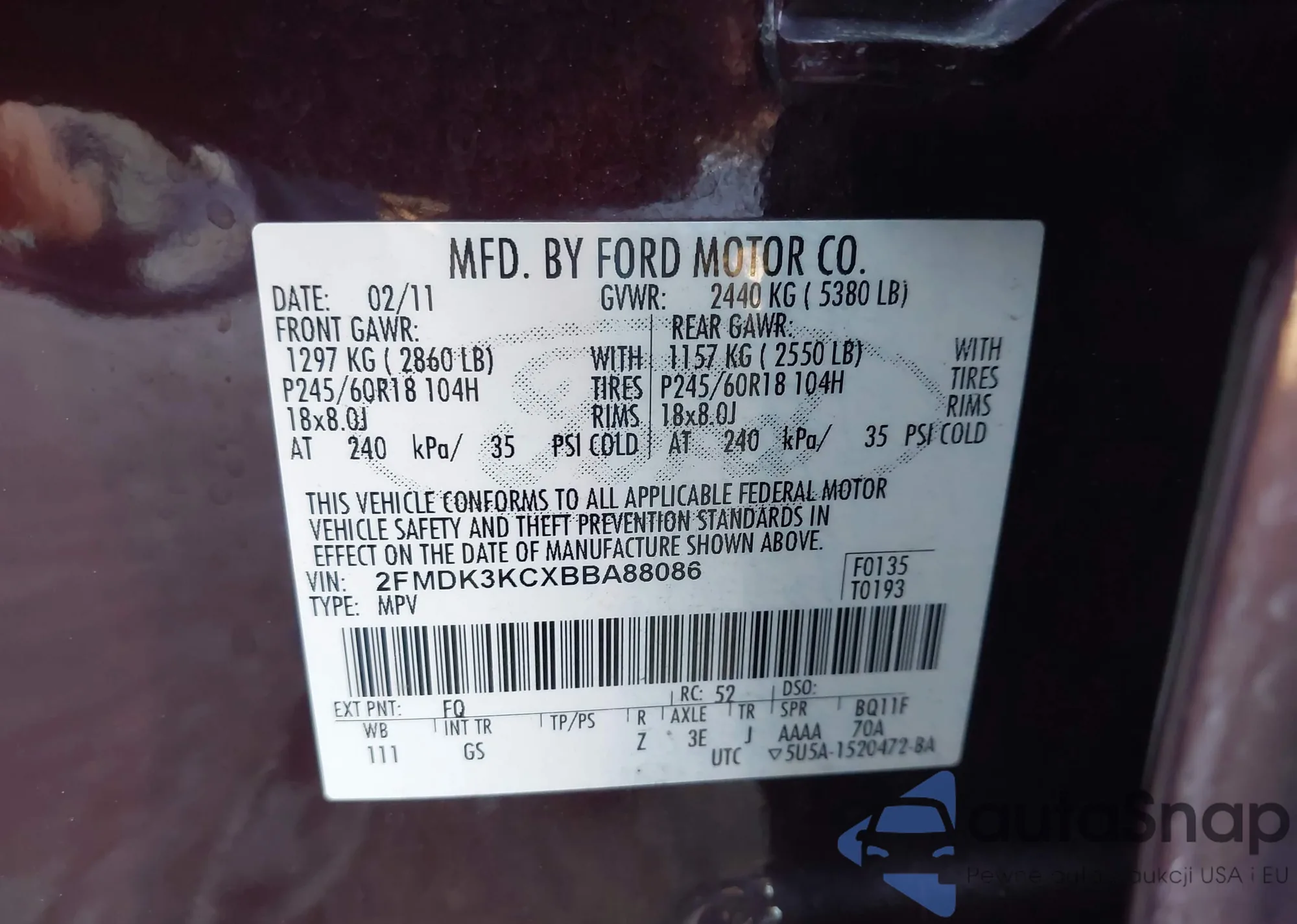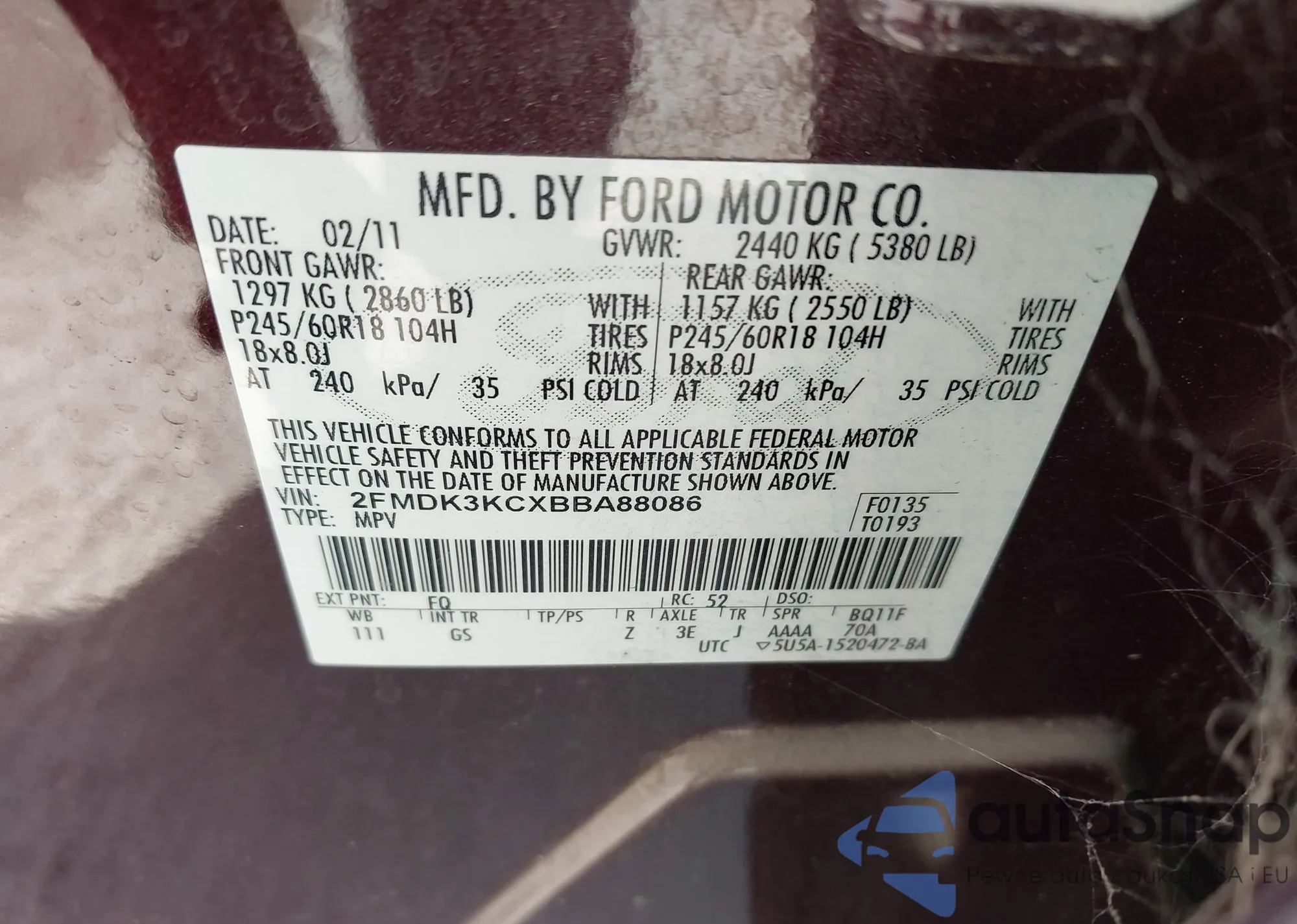 Samochód Ford Edge 2011 (VIN 2FMDK3KCXBBA88086) nie był wcześniej licytowany. Dokumenty są czyste, przebieg odpowiada lub jest niższy niż średnia rynku. Sprzedaje go firma ubezpieczeniowa – polecamy zakup. Dostawa do portu zajmie ok. 6–8 tygodni.
