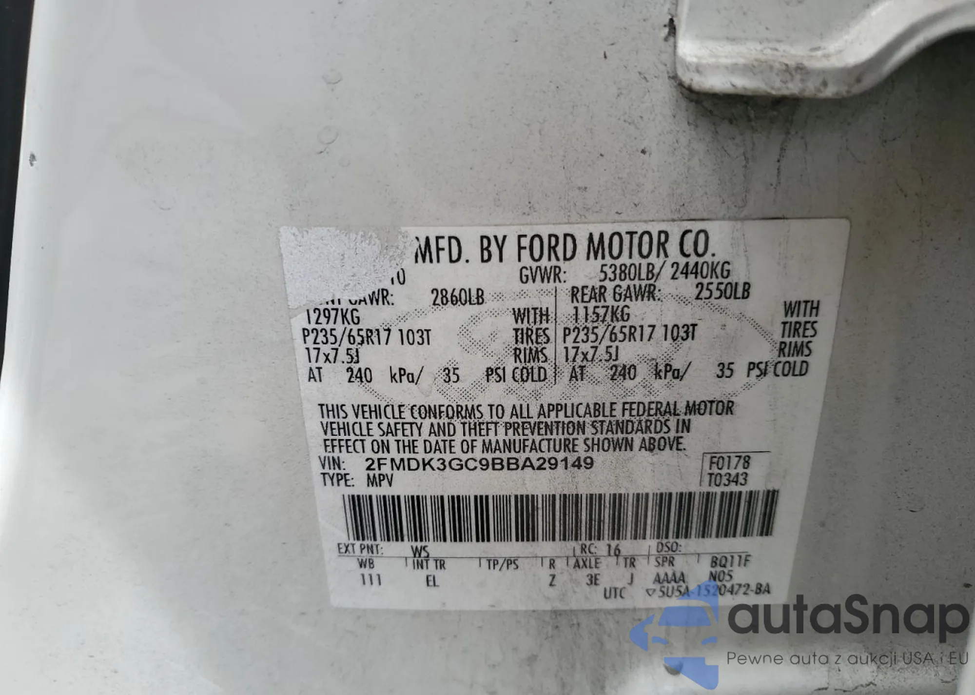 VIN: 2FMDK3GC9BBA29149