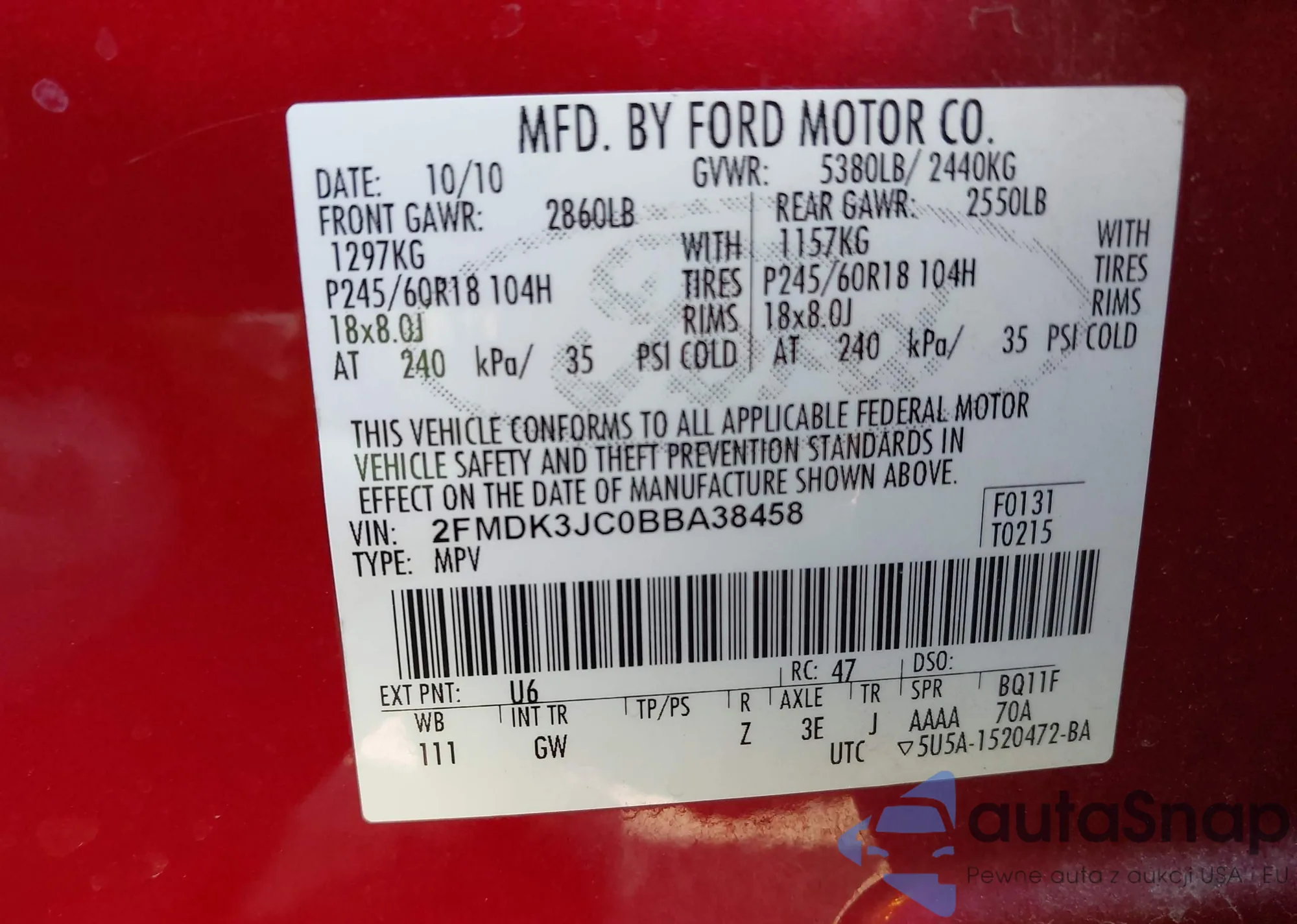 VIN: 2FMDK3JC0BBA38458