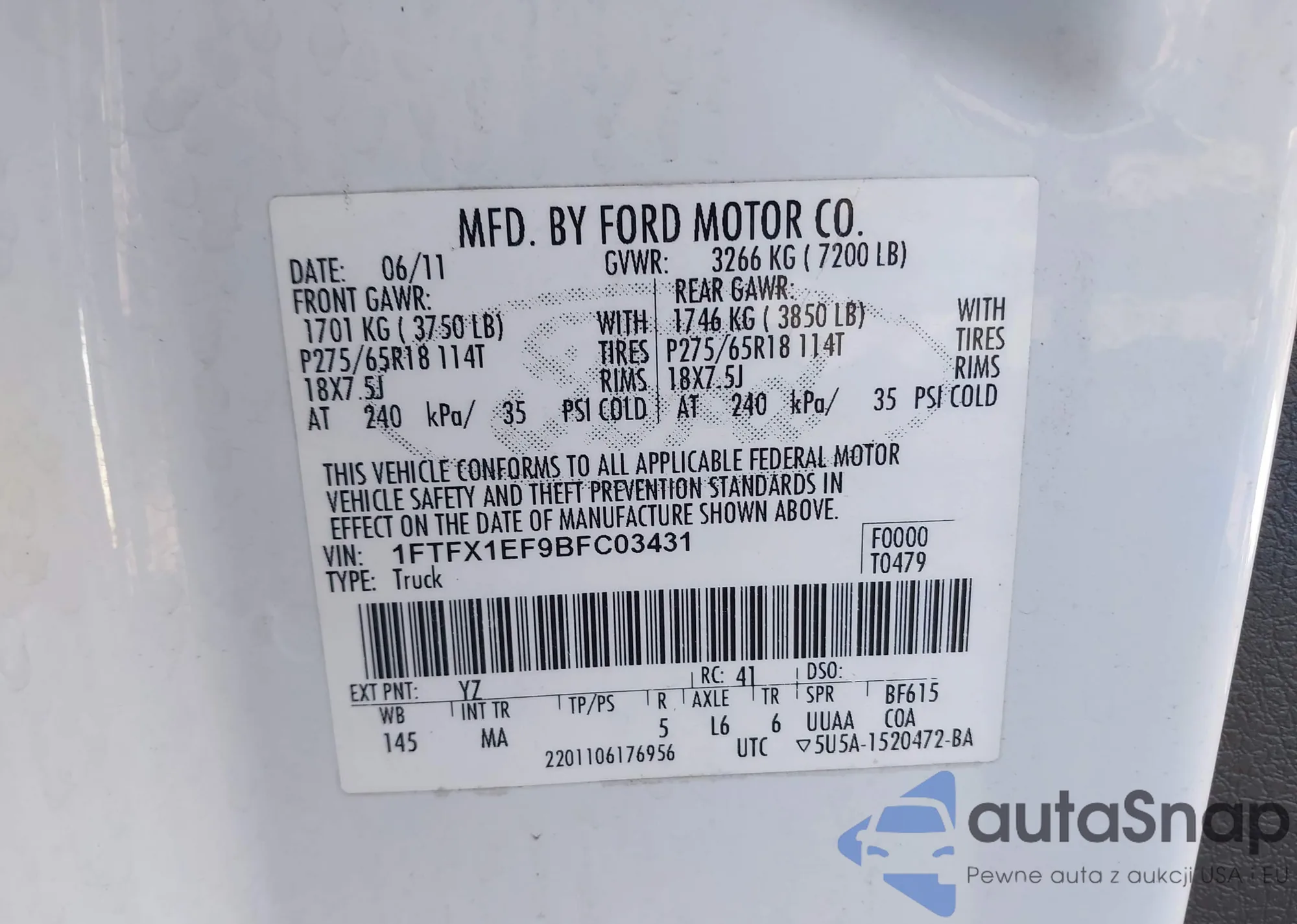 Samochód Ford F-150 2011 (VIN 1FTFX1EF9BFC03431) nie był wcześniej licytowany. Dokumenty są czyste, przebieg odpowiada lub jest niższy niż średnia rynku. Sprzedaje go firma ubezpieczeniowa – polecamy zakup. Dostawa do portu zajmie ok. 6–8 tygodni.