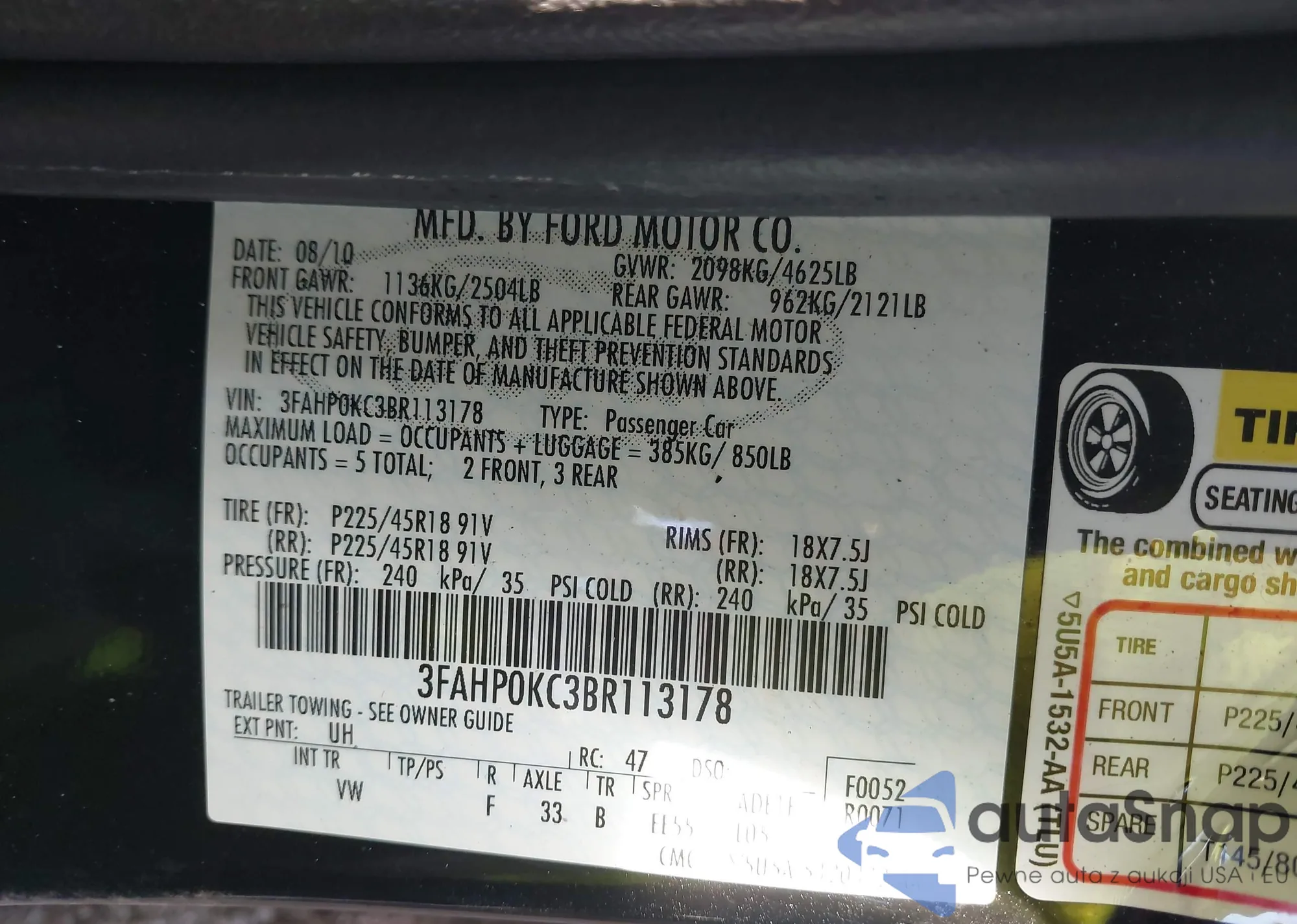 • VIN: 3FAHP0KC3BR113178