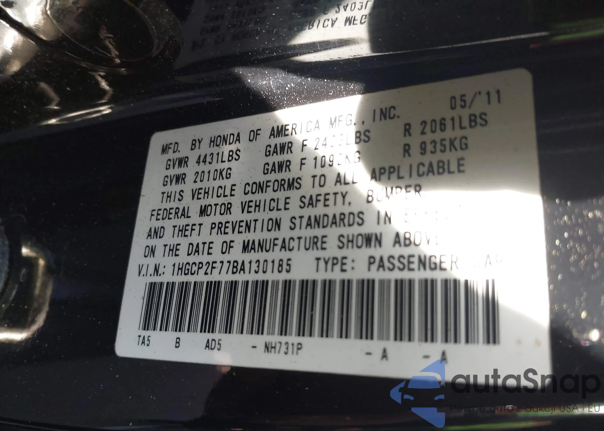 VIN: 1HGCP2F77BA130185