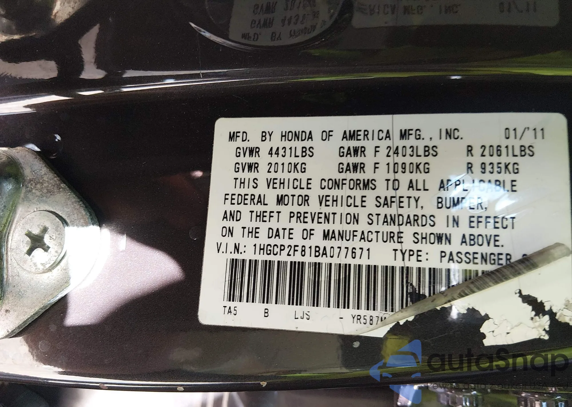 VIN: 1HGCP2F81BA077671