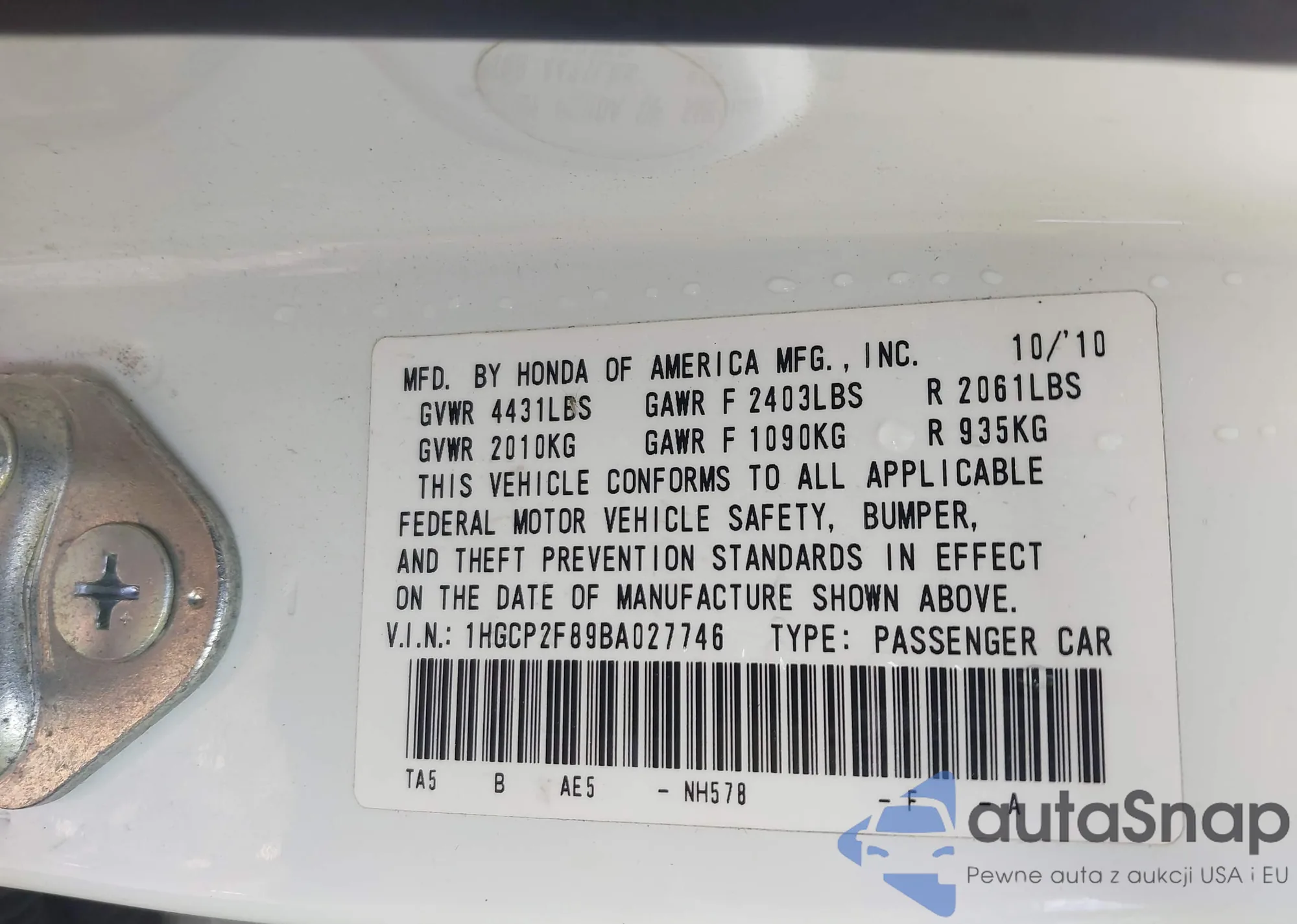 VIN: 1HGCP2F89BA027746