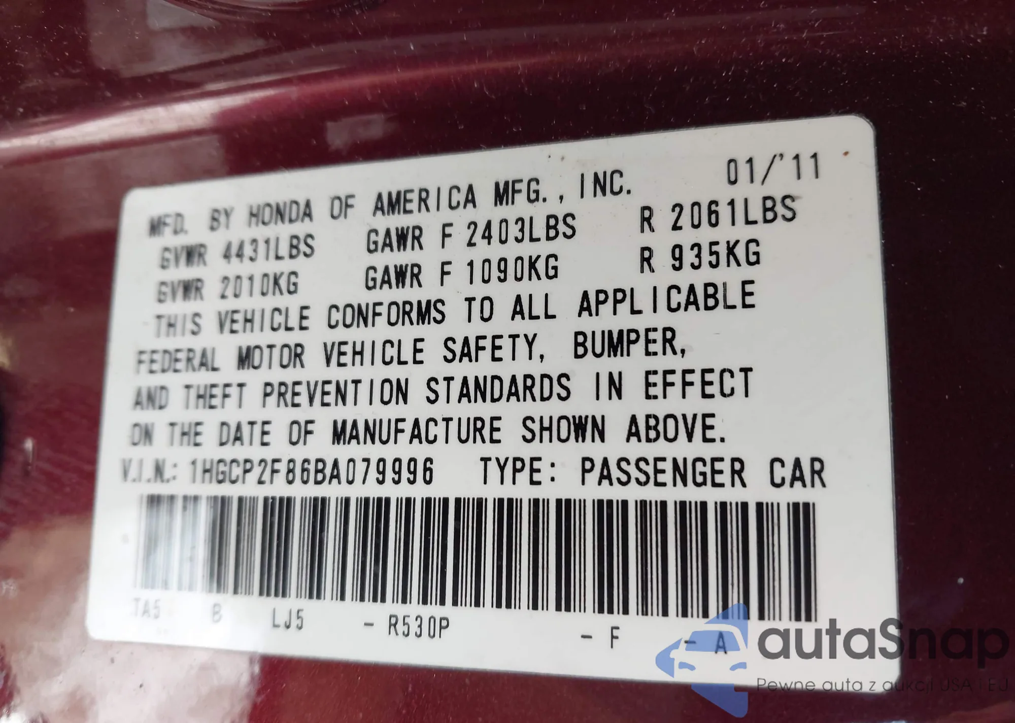 Samochód Honda Accord 2011 (VIN 1HGCP2F86BA079996) nie był wcześniej licytowany. Dokumenty są czyste, przebieg odpowiada lub jest niższy niż średnia rynku. Sprzedaje go firma ubezpieczeniowa – polecamy zakup. Dostawa do portu zajmie ok. 6–8 tygodni.