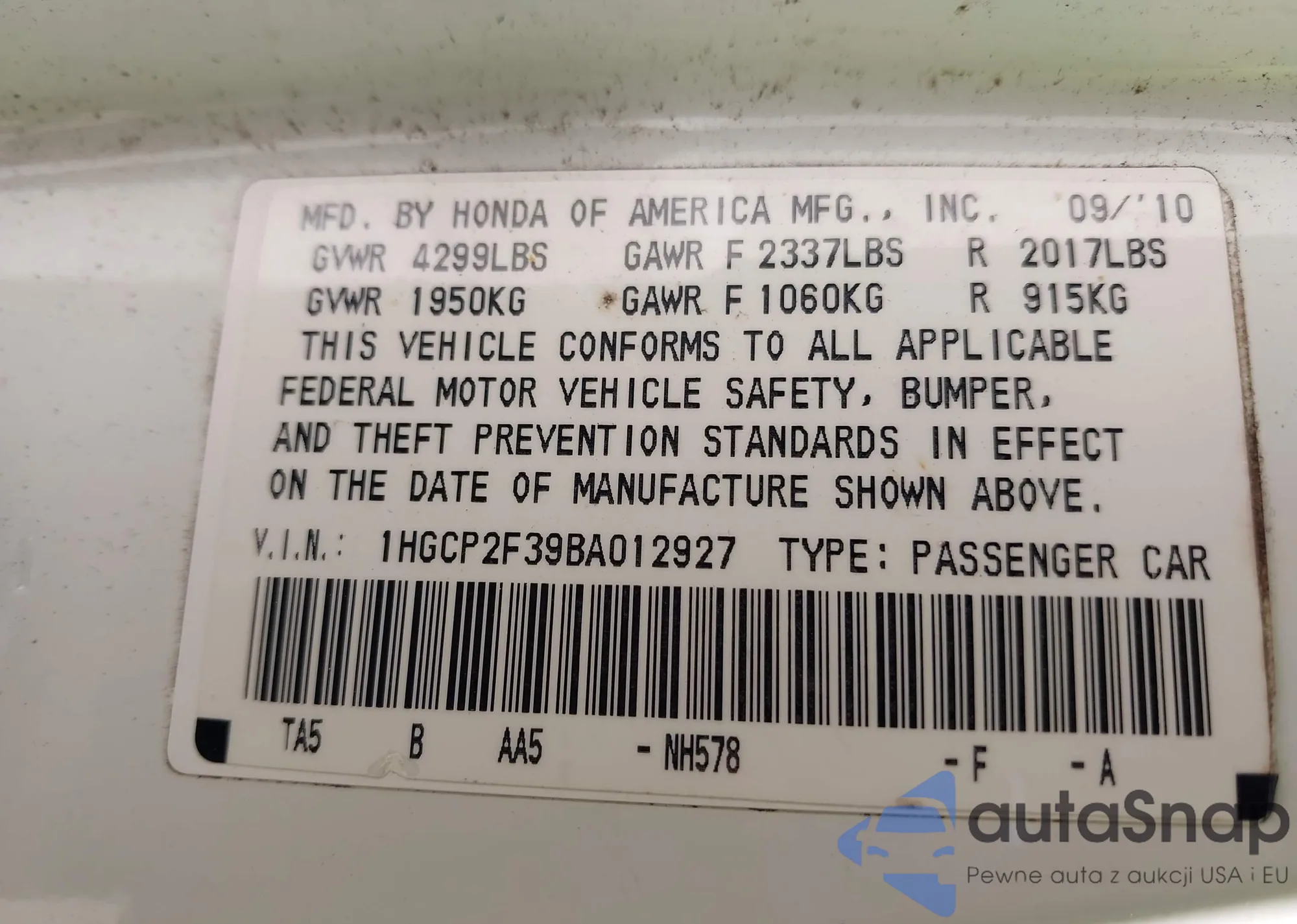 VIN: 1HGCP2F39BA012927