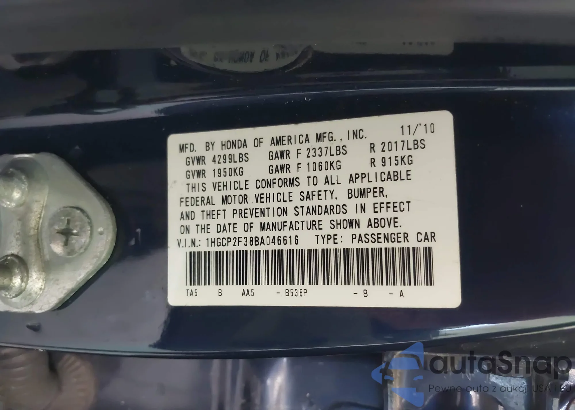 VIN: 1HGCP2F38BA046616