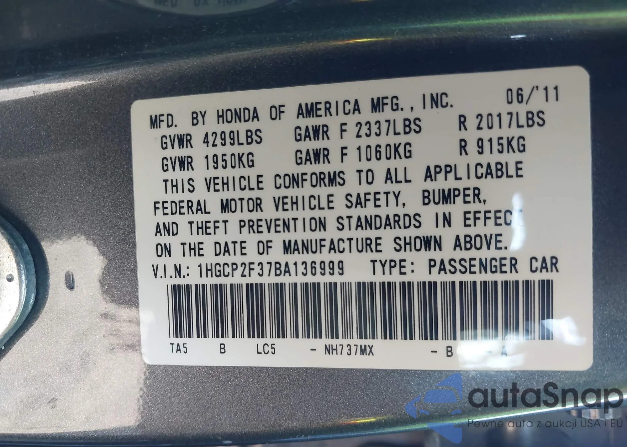 VIN: 1HGCP2F37BA136999
