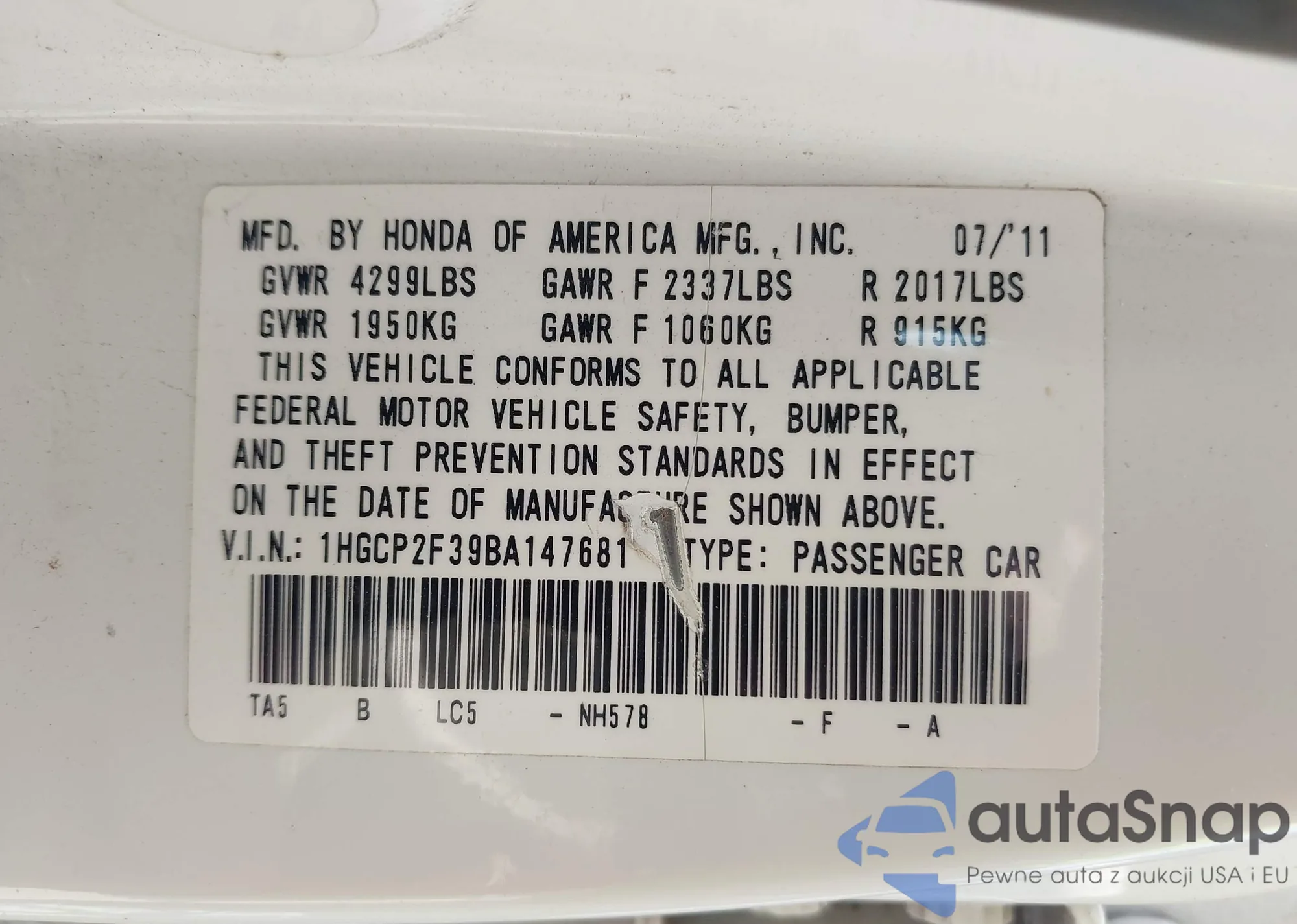 VIN: 1HGCP2F39BA147681