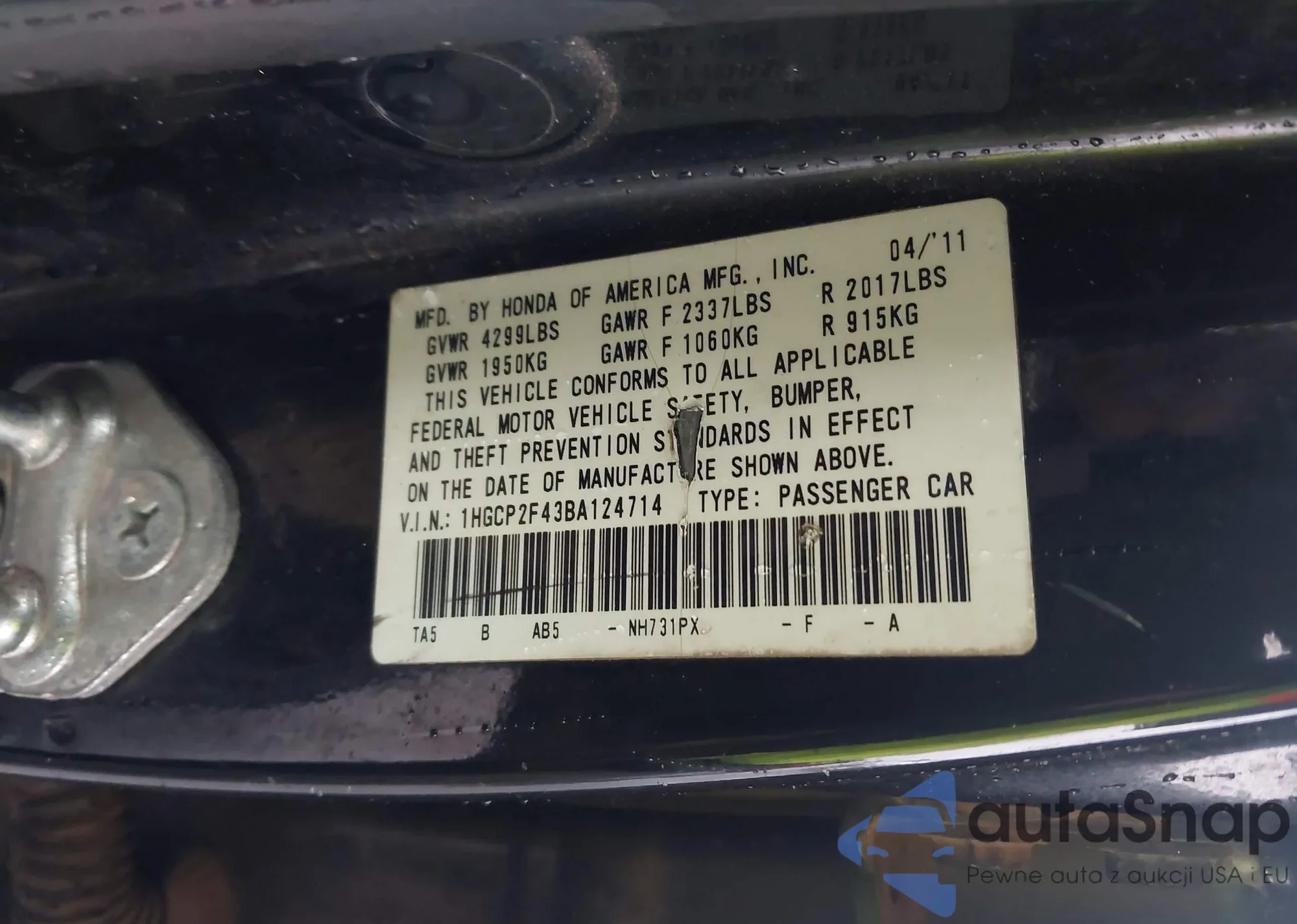VIN: 1HGCP2F43BA124714
