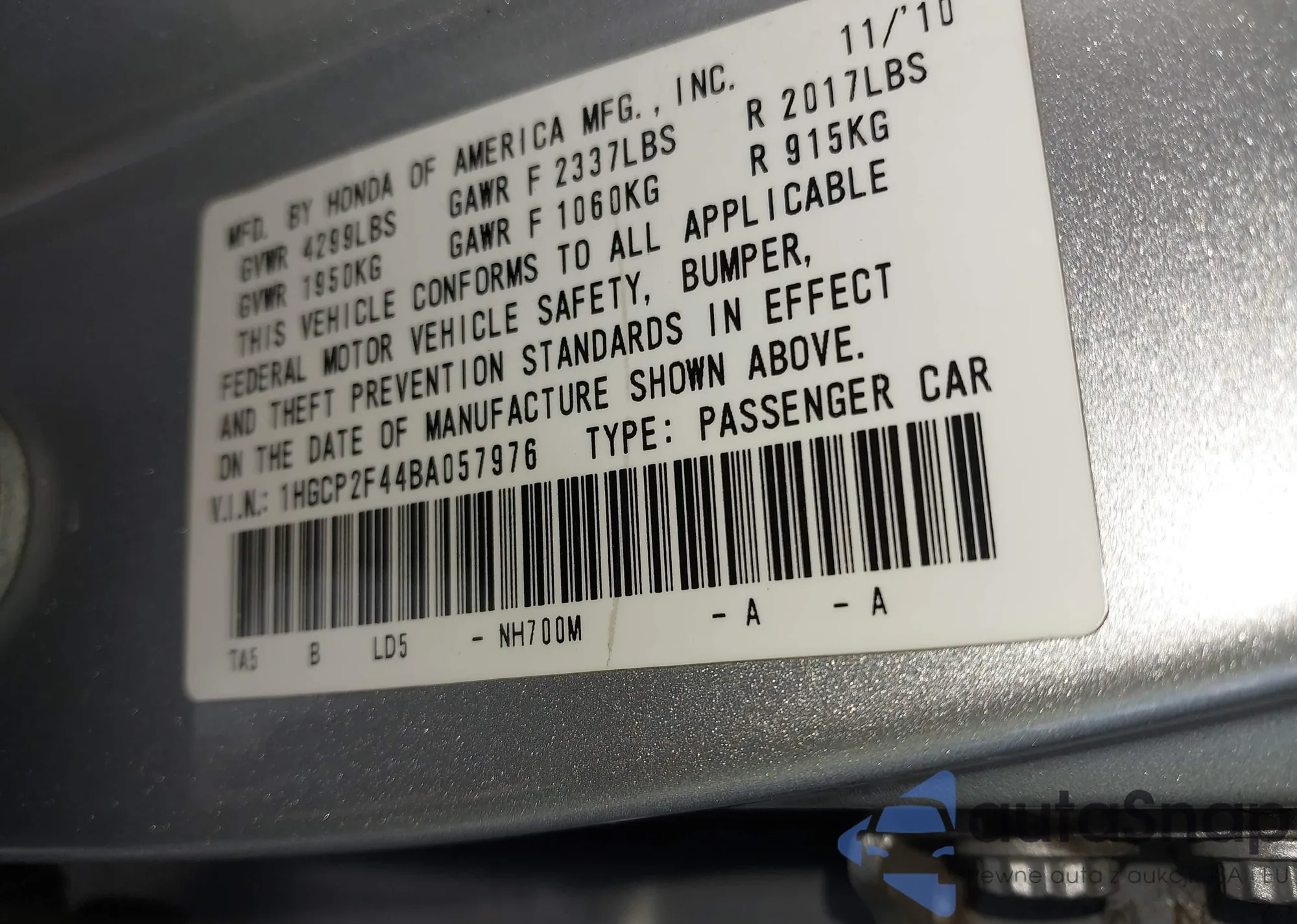 VIN: 1HGCP2F44BA057976
