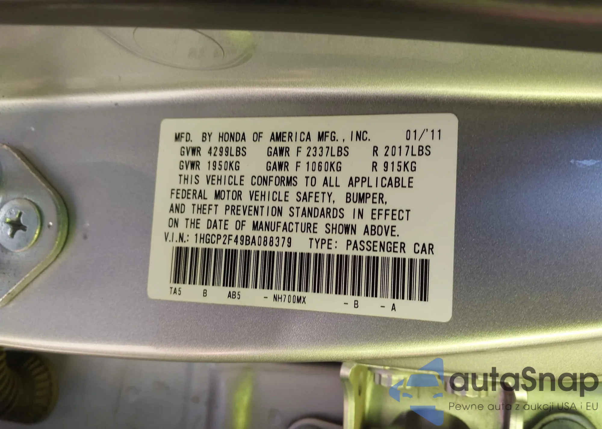 • VIN: 1HGCP2F49BA088379