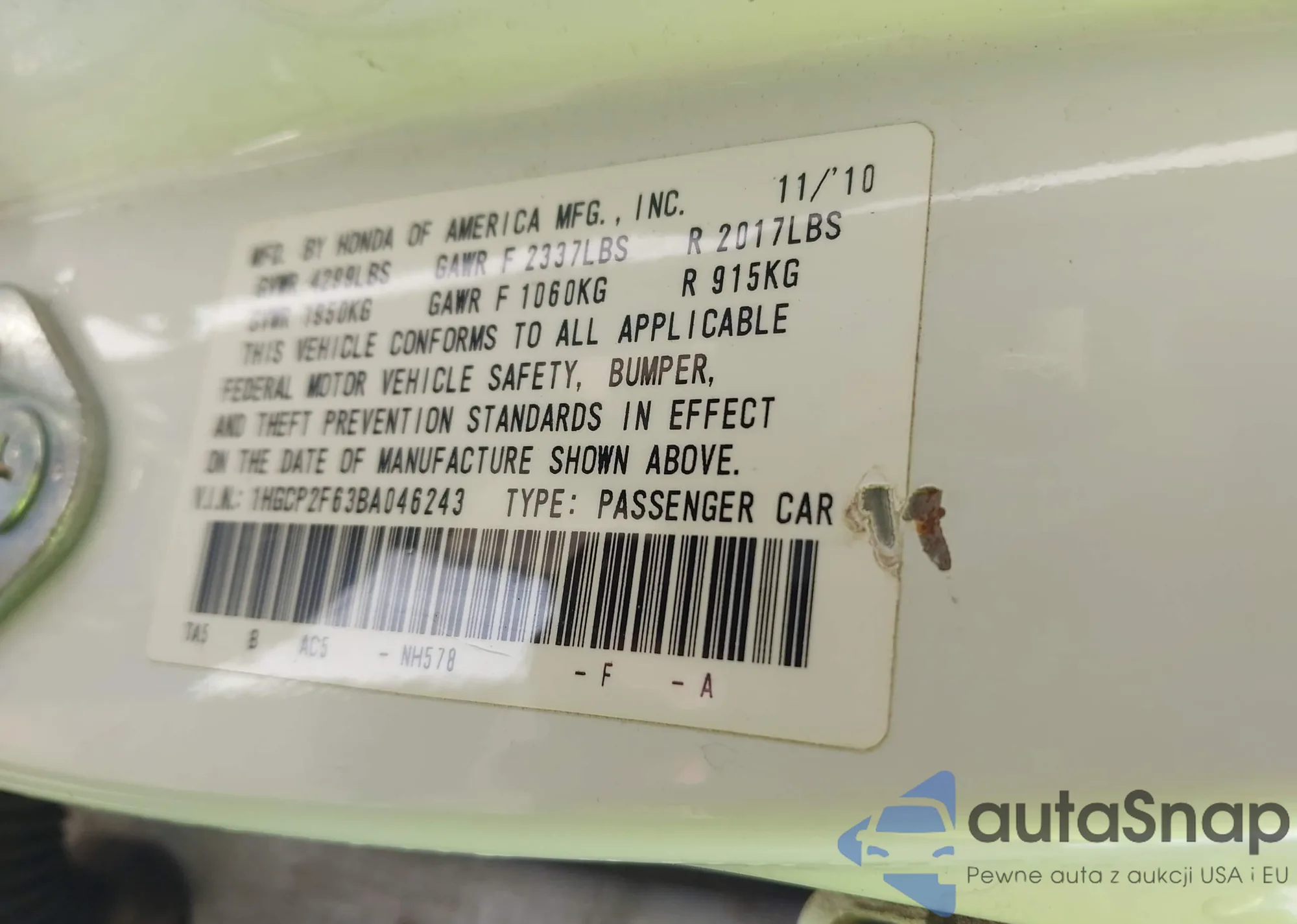 VIN: 1HGCP2F63BA046243