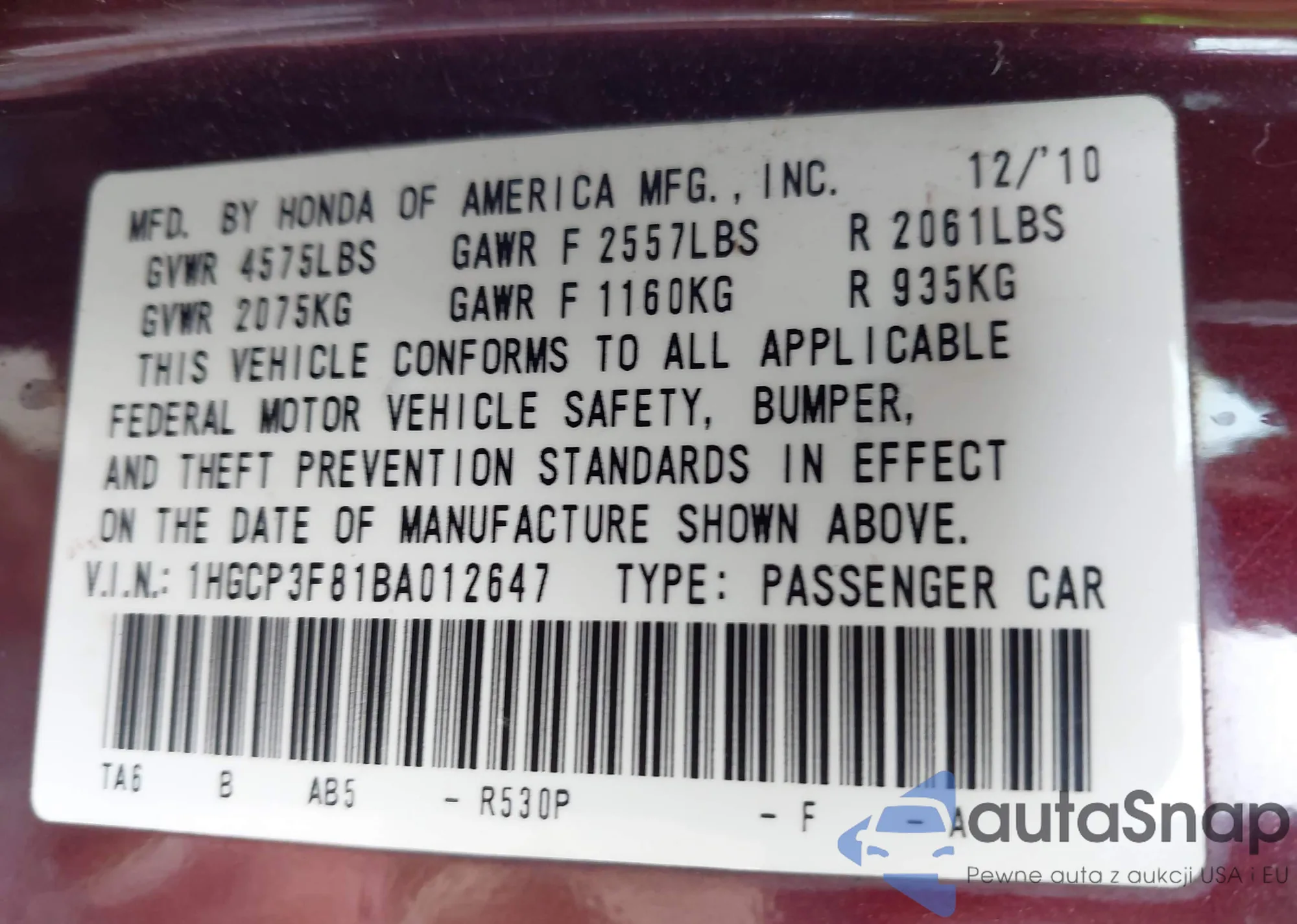 VIN: 1HGCP3F81BA012647