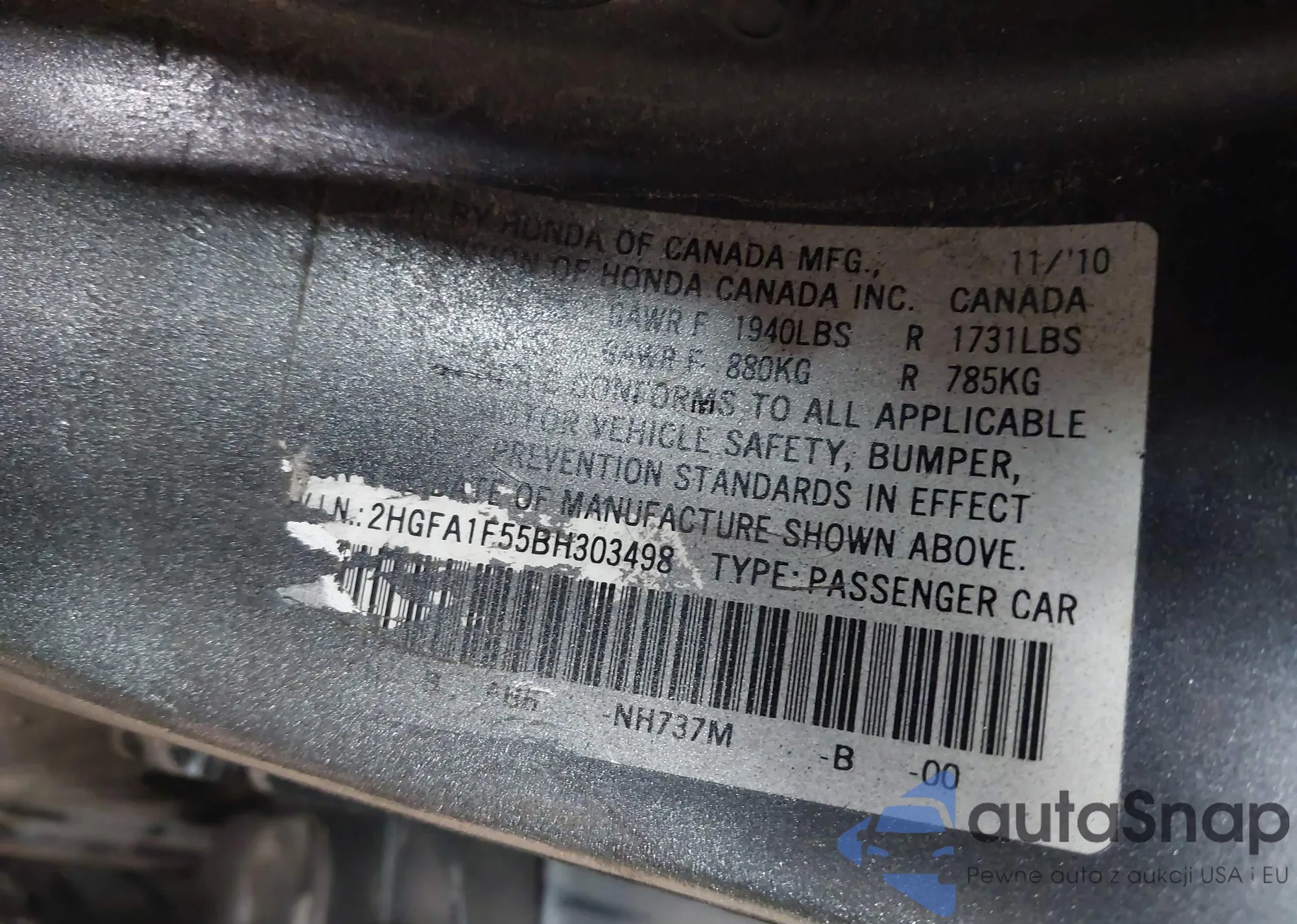 VIN: 2HGFA1F55BH303498