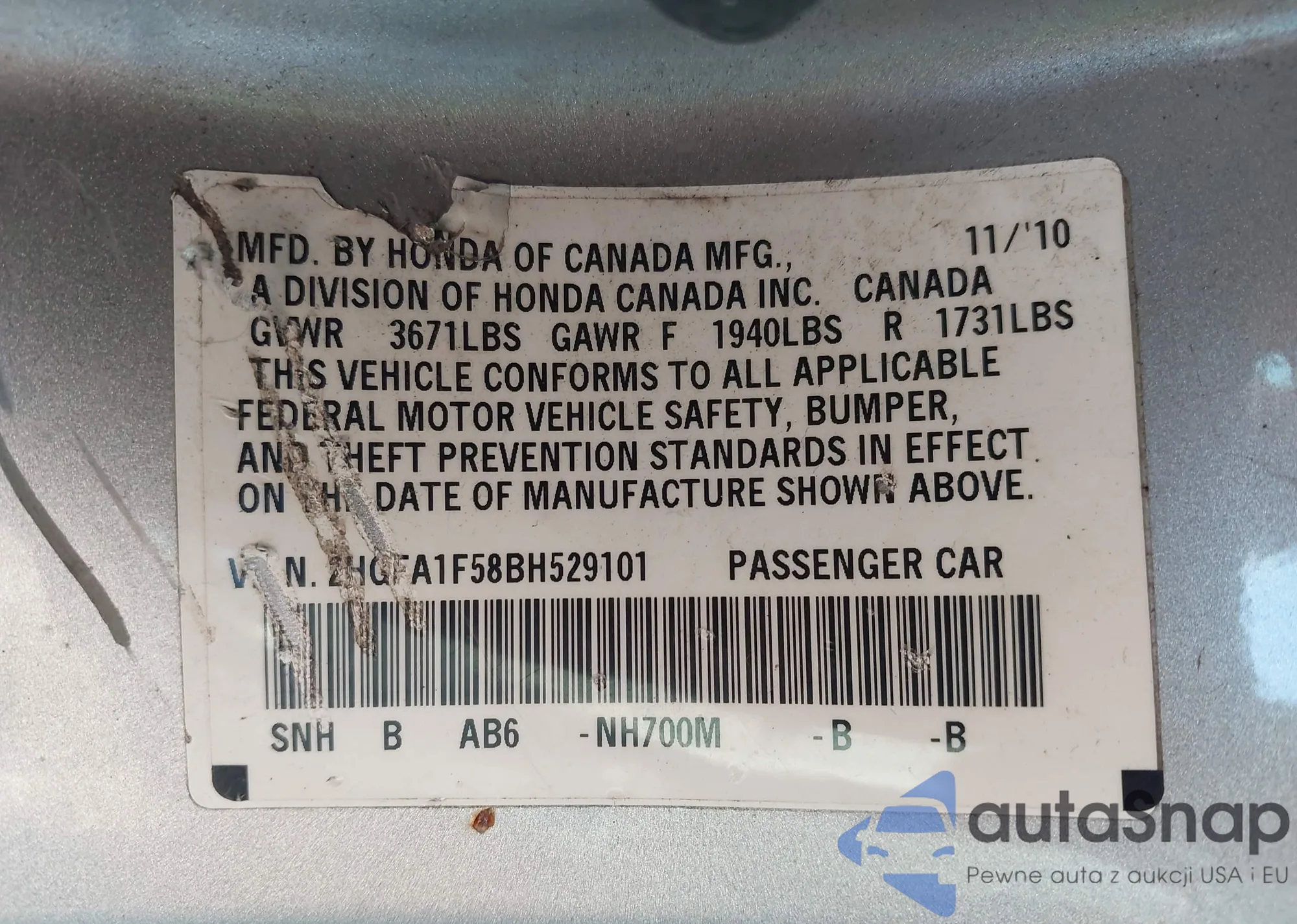 VIN: 2HGFA1F58BH529101