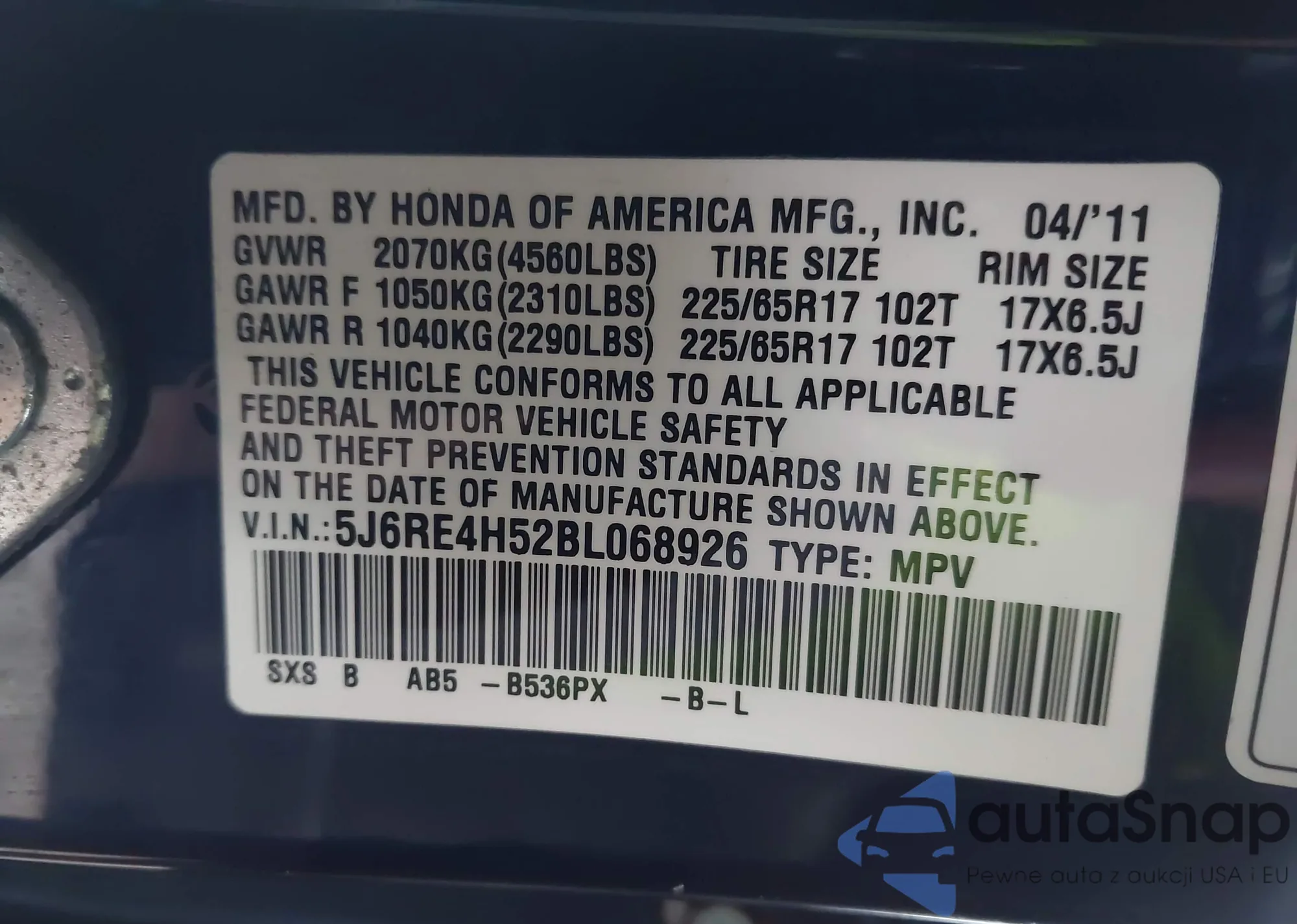 VIN: 5J6RE4H52BL068926