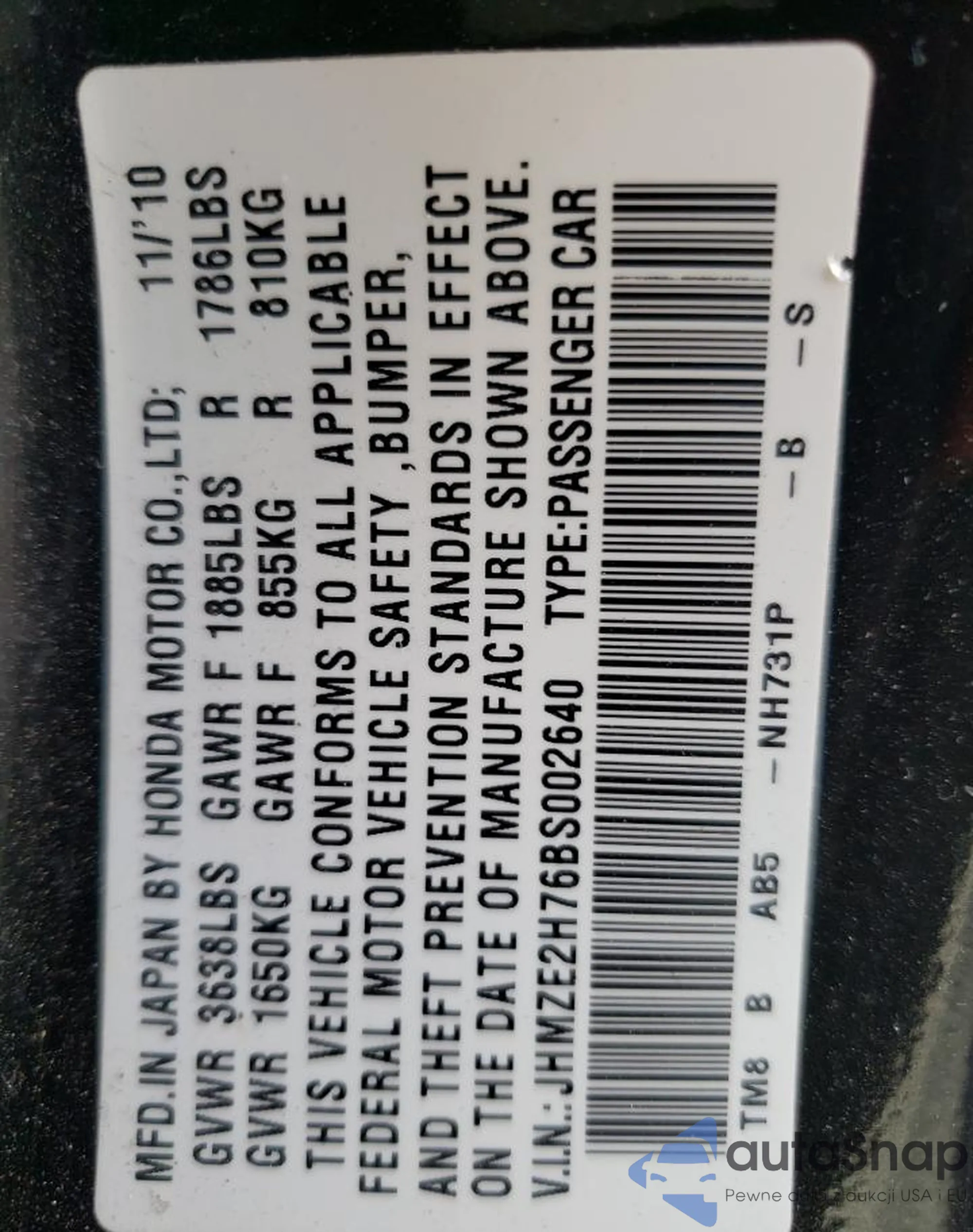 VIN: JHMZE2H76BS002640