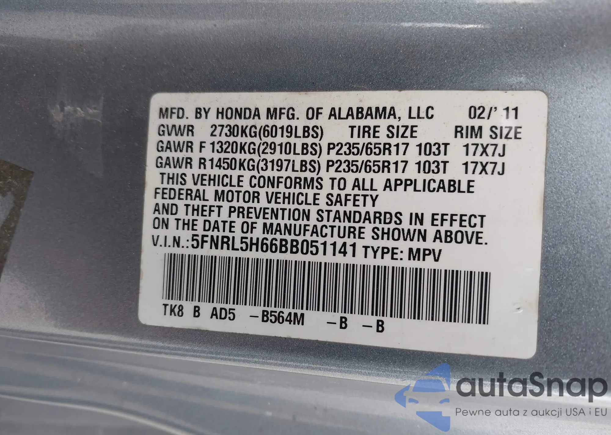 • VIN: 5FNRL5H66BB051141