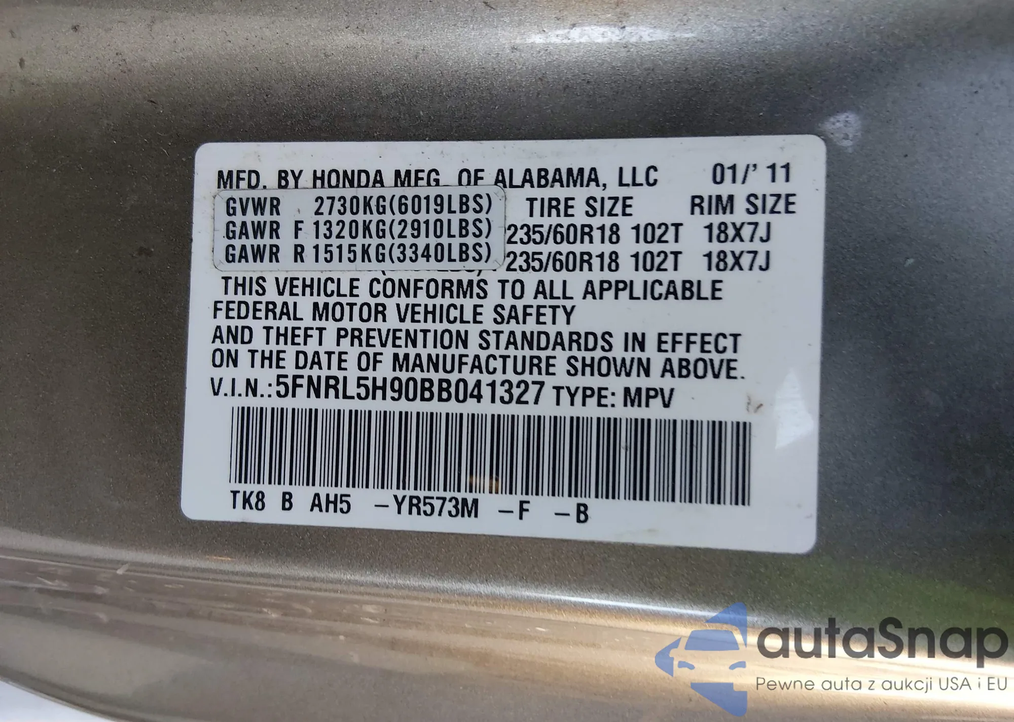 • VIN: 5FNRL5H90BB041327