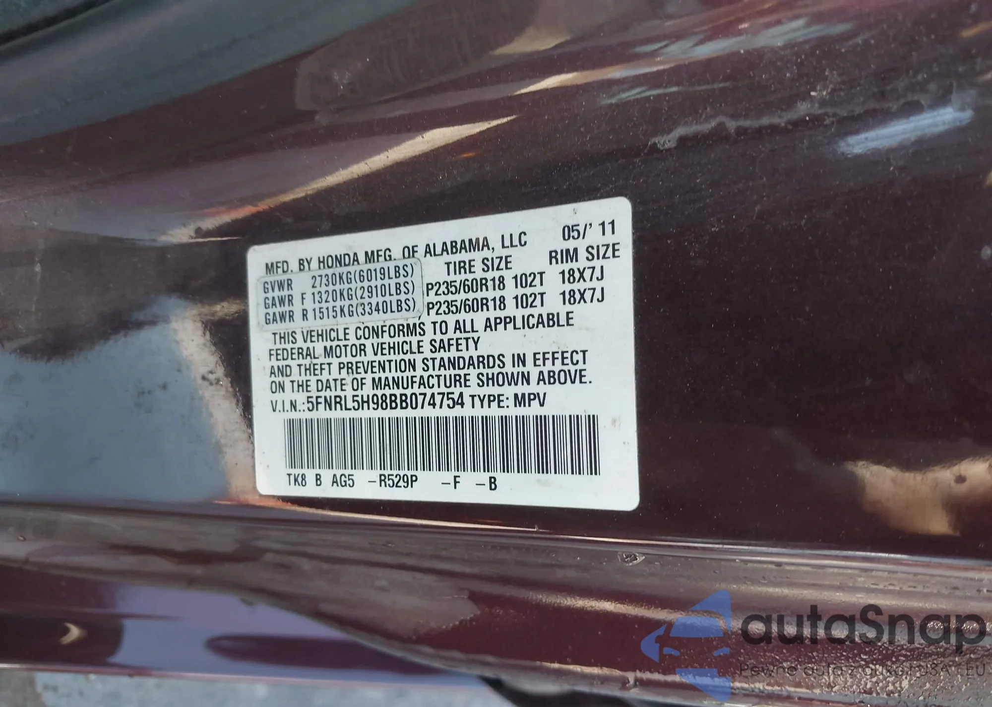VIN: 5FNRL5H98BB074754