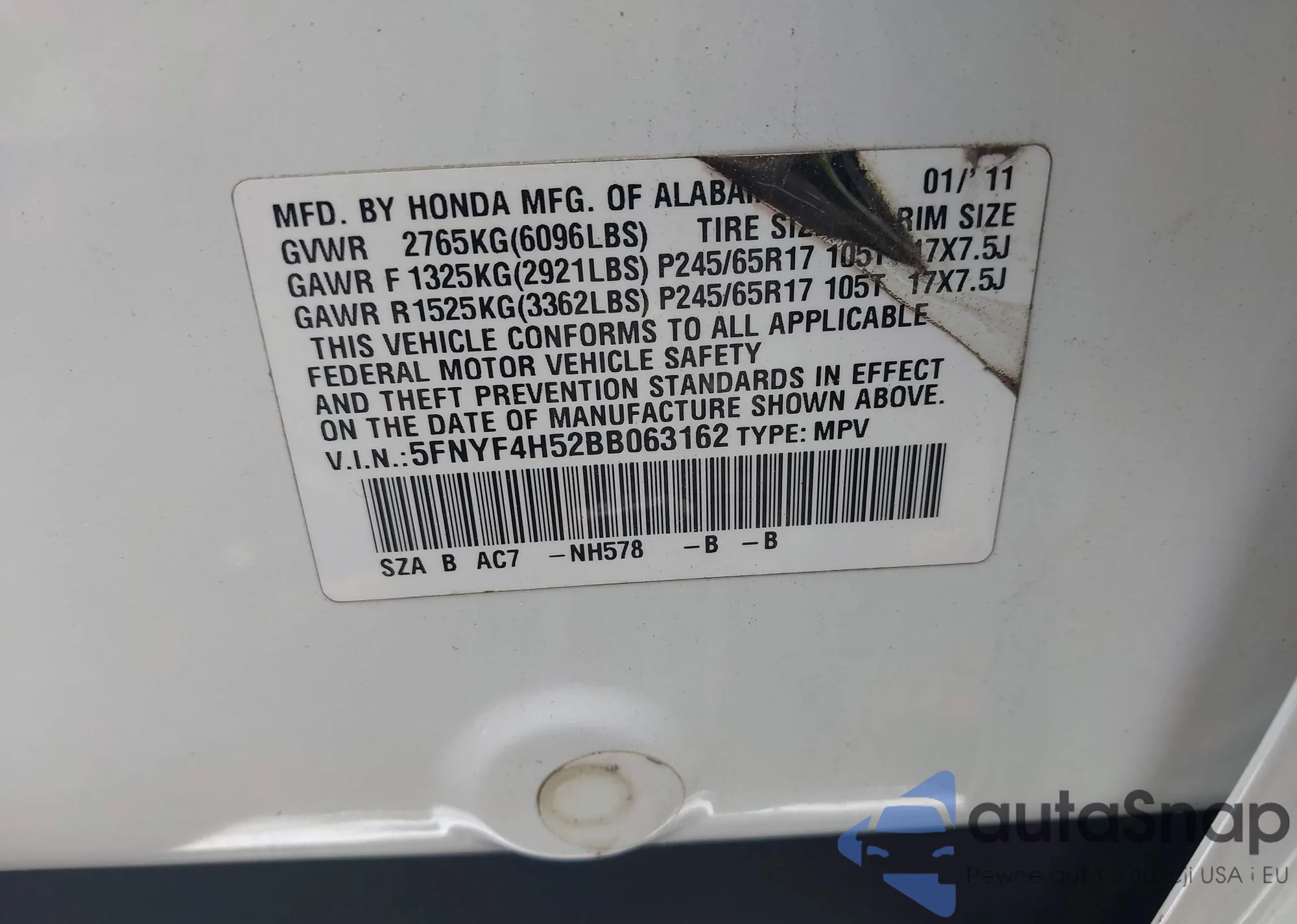 VIN: 5FNYF4H52BB063162