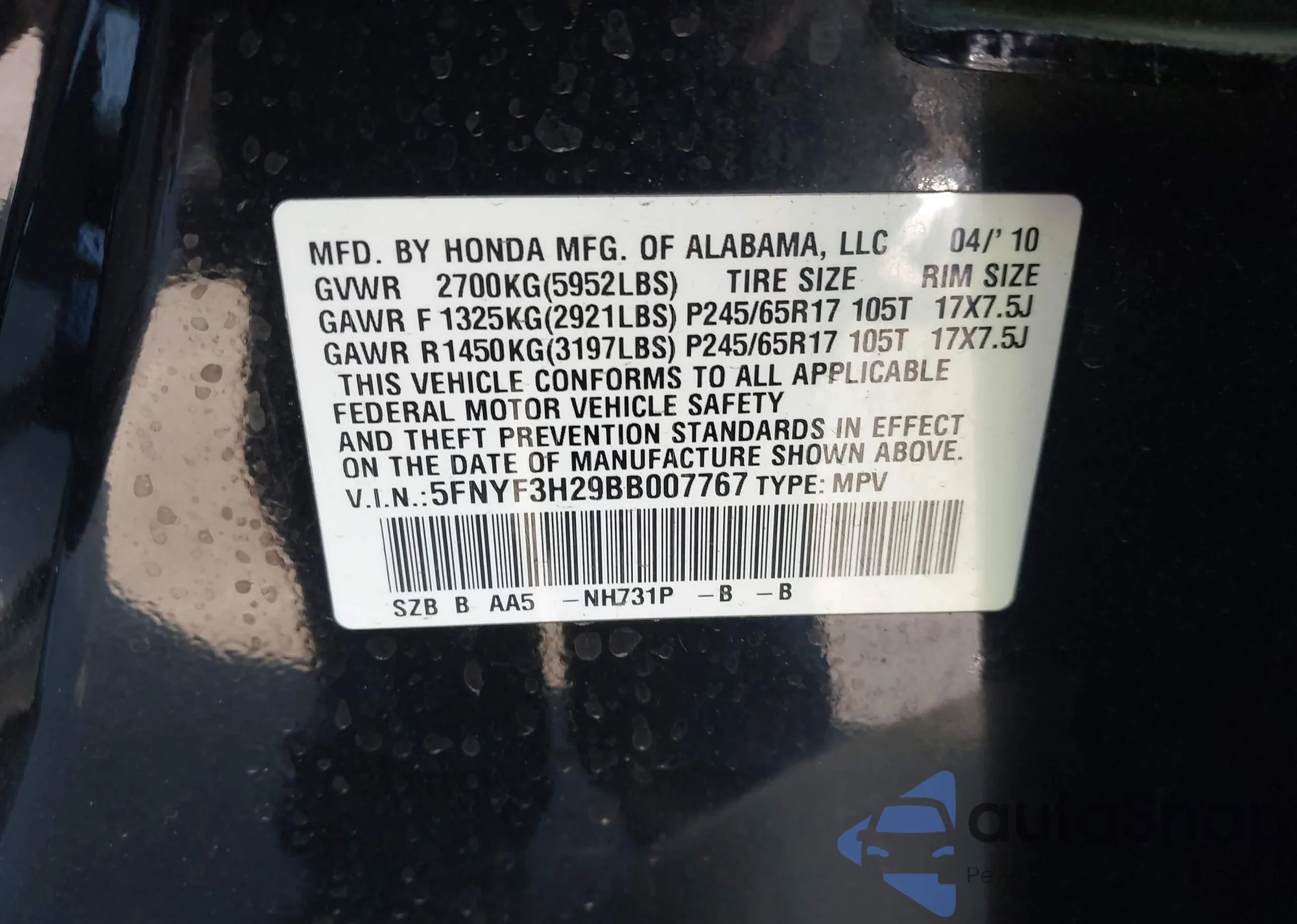 VIN: 5FNYF3H29BB007767