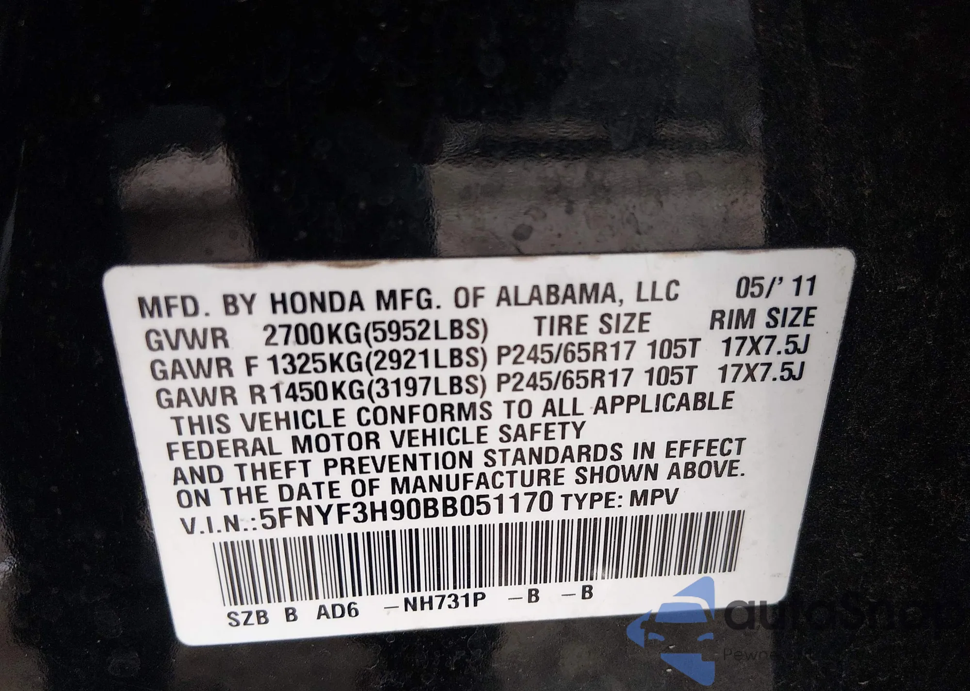 • VIN: 5FNYF3H90BB051170