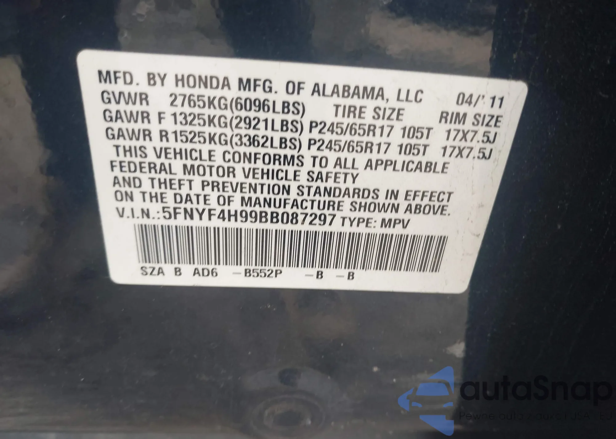 VIN: 5FNYF4H99BB087297