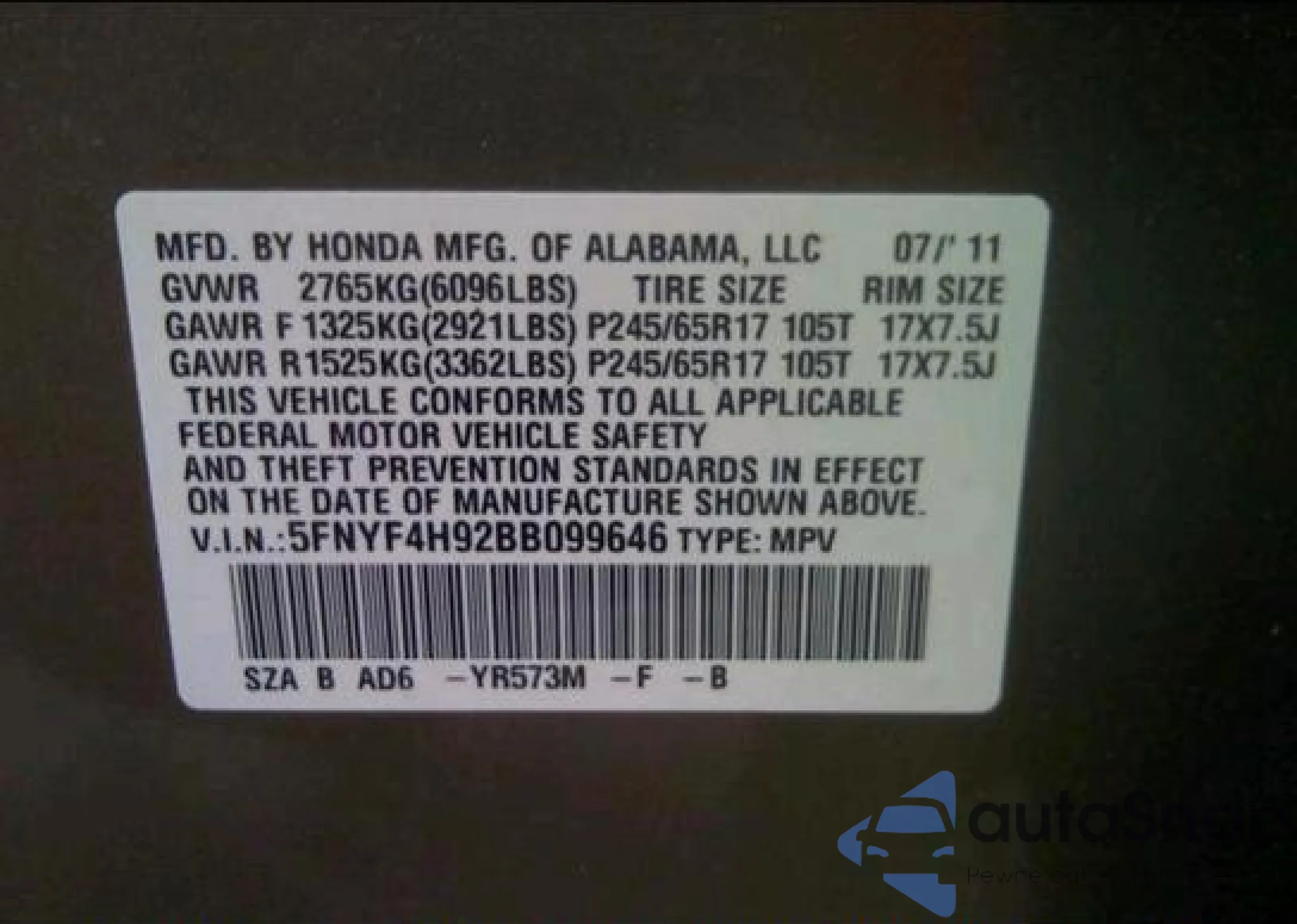 • VIN: 5FNYF4H92BB099646