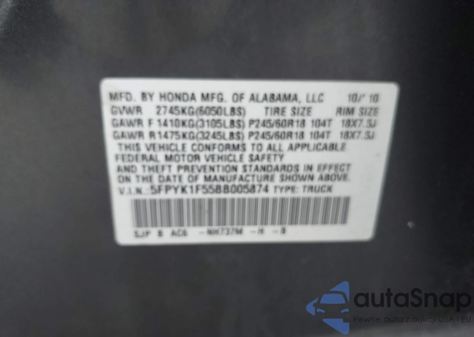 VIN: 5FPYK1F55BB005874