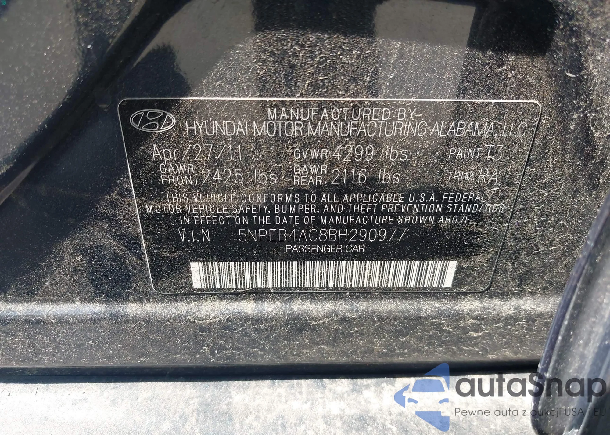 Samochód Hyundai Sonata 2011 (VIN 5NPEB4AC8BH290977) nie był wcześniej licytowany. Dokumenty są czyste, przebieg odpowiada lub jest niższy niż średnia rynku. Sprzedaje go firma ubezpieczeniowa – polecamy zakup. Dostawa do portu zajmie ok. 6–8 tygodni.