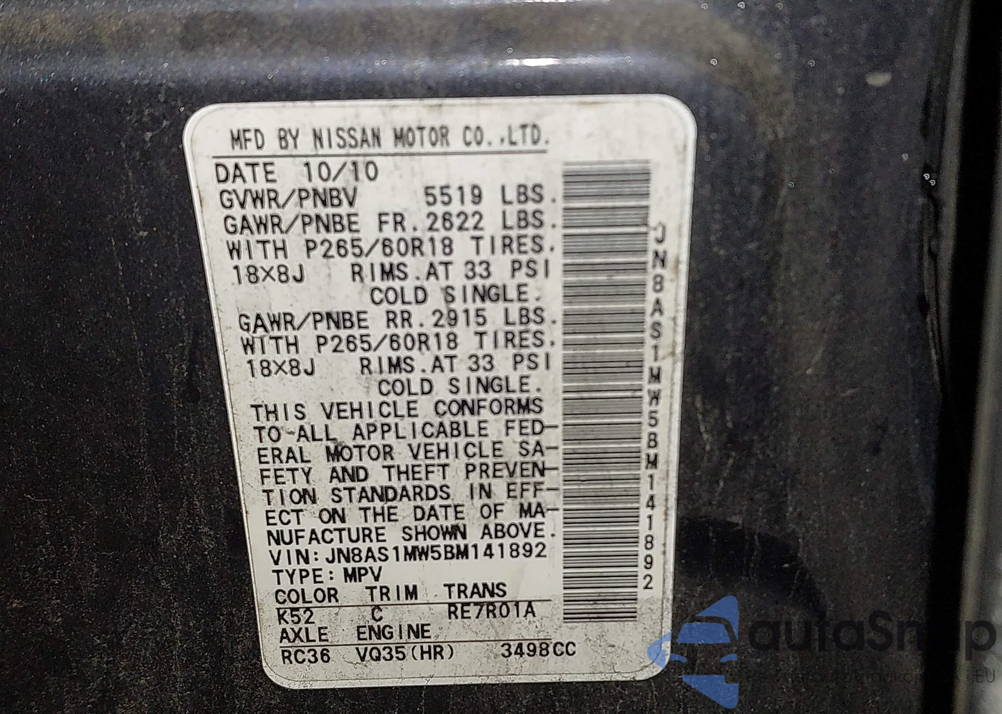 • VIN: JN8AS1MW5BM141892