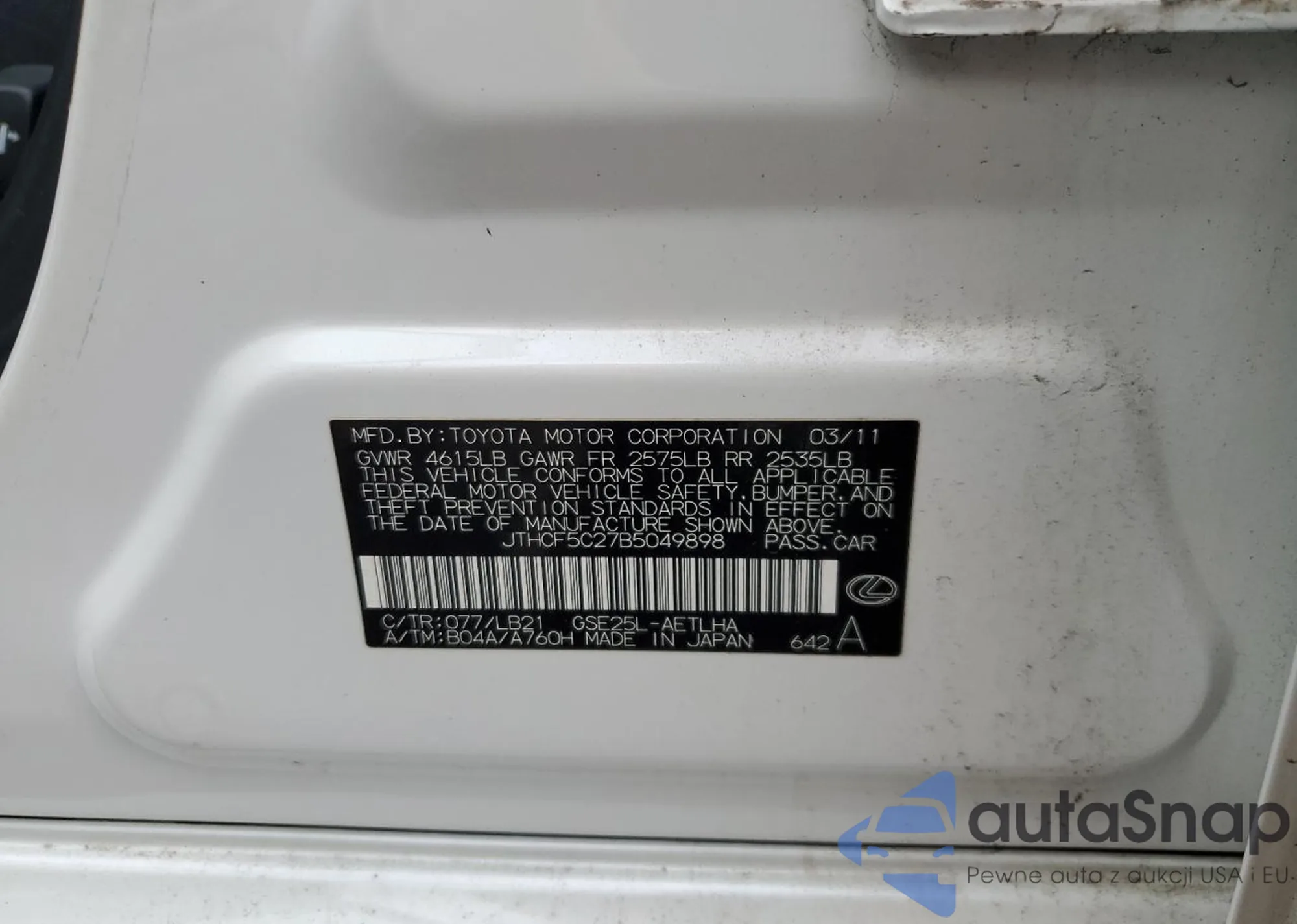 Samochód Lexus IS 2011 (VIN JTHCF5C27B5049898) nie był wcześniej licytowany. Dokumenty są czyste, przebieg odpowiada lub jest niższy niż średnia rynku. Sprzedaje go firma ubezpieczeniowa – polecamy zakup. Dostawa do portu zajmie ok. 6–8 tygodni.