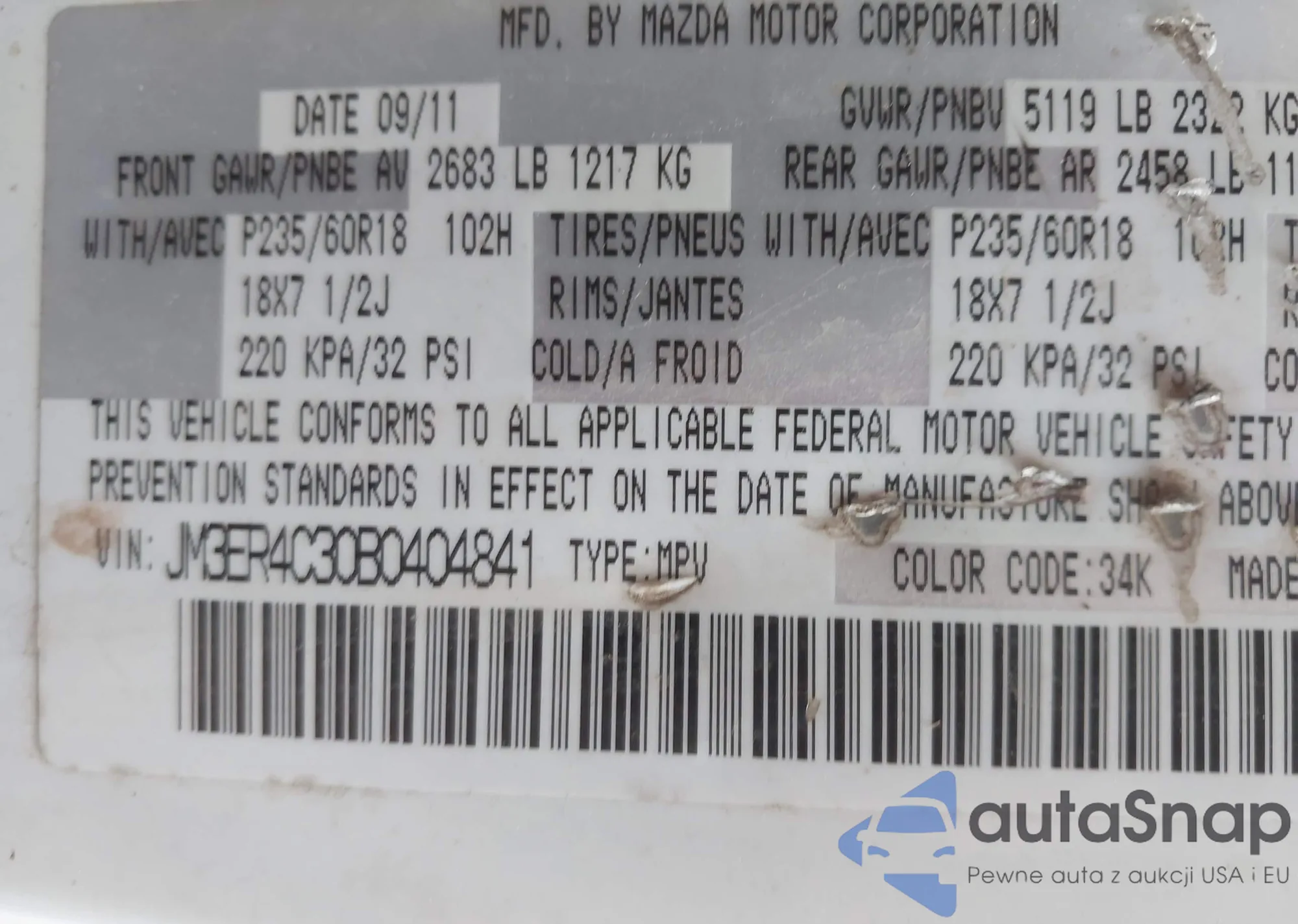 Samochód Mazda CX-7 2011 (VIN JM3ER4C30B0404841) ma dokumenty uniemożliwiające rejestrację. Mogą pojawić się trudności przy eksporcie i rejestracji. Skontaktuj się z ekspertami AutaSnap w celu znalezienia alternatywy.