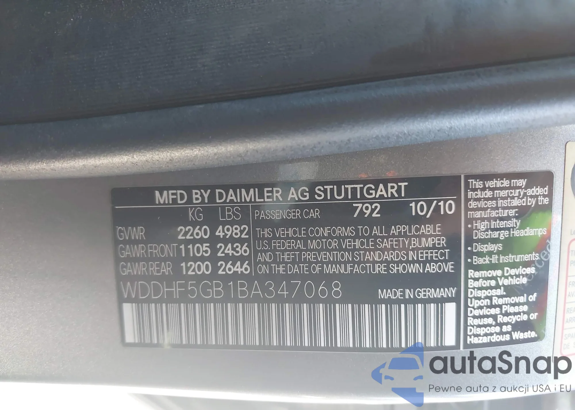 • VIN: WDDHF5GB1BA347068