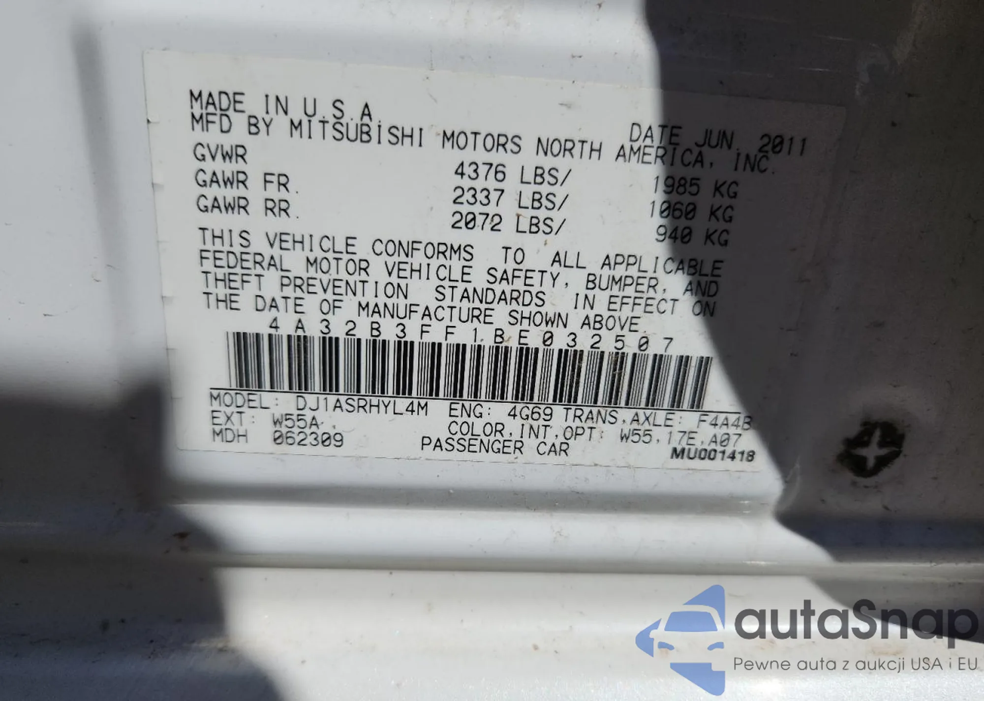 Samochód Mitsubishi Galant 2011 (VIN 4A32B3FF1BE032507) nie był wcześniej licytowany. Dokumenty są czyste, przebieg odpowiada lub jest niższy niż średnia rynku. Sprzedaje go firma ubezpieczeniowa – polecamy zakup. Dostawa do portu zajmie ok. 6–8 tygodni.