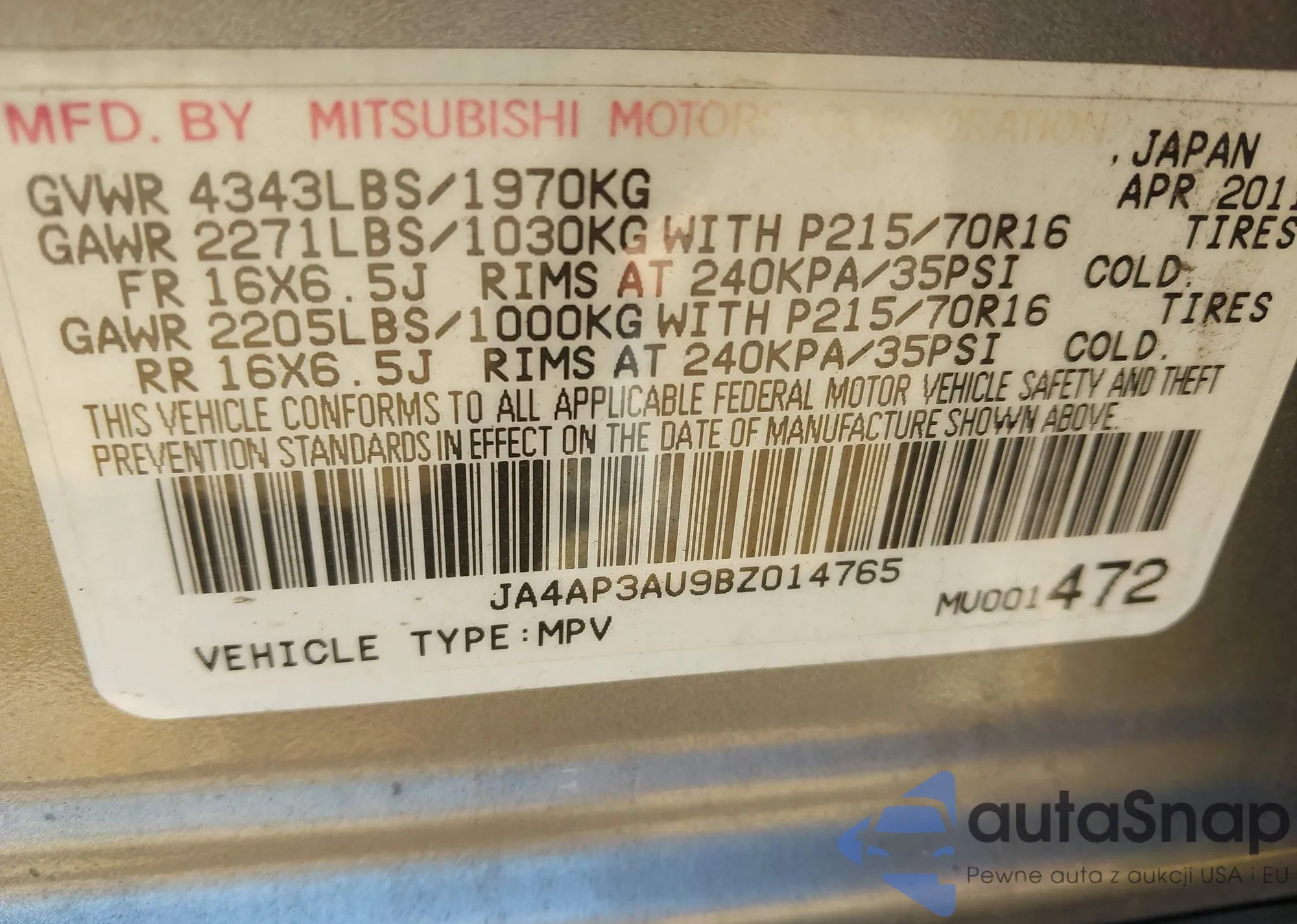VIN: JA4AP3AU9BZ014765