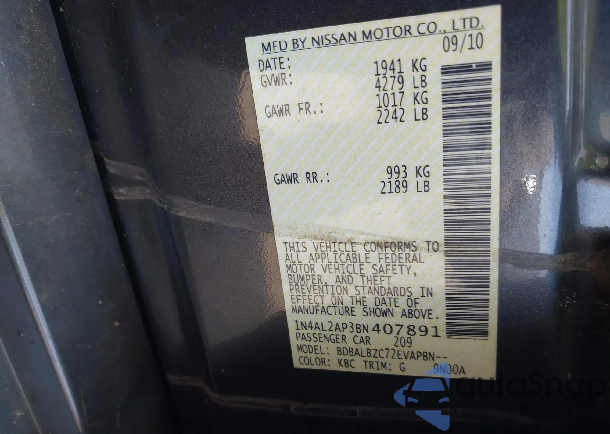VIN: 1N4AL2AP3BN407891